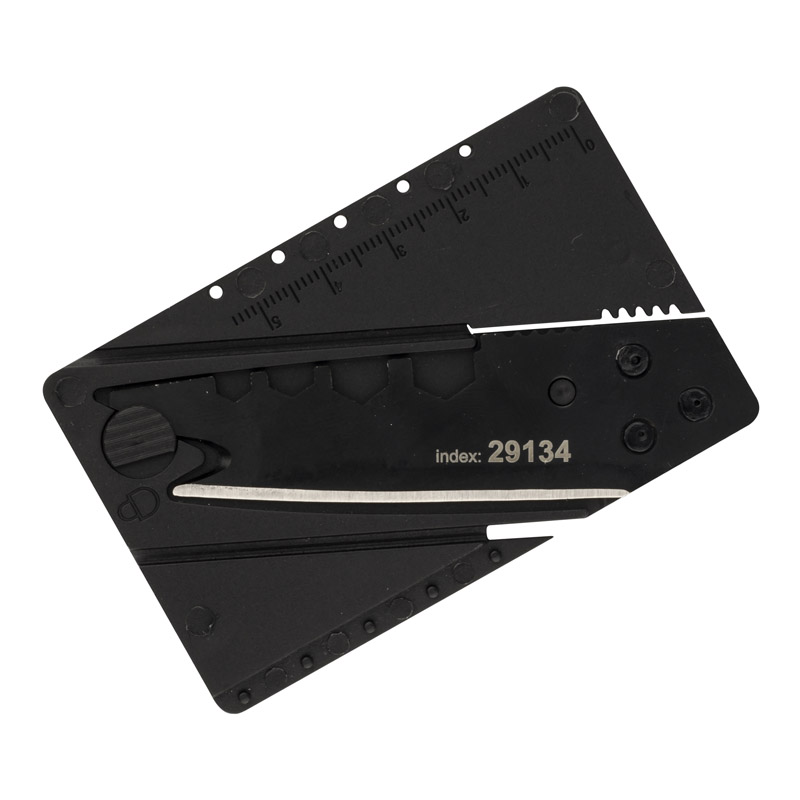 Nóż składany KLINGO to rozwiązanie w sytuacji, gdy nóż jest niezbędny a nie mamy przy sobie. Dzięki wymiarom i kształcie bliskim karty kredytowej ten gadżet zmieści się do portfela, dzięki czemu zawsze będzie pod ręką. Przemyślana budowa pozwala na złożenie ostrza w kilka sekund. Funkcje: linijka, nóż, klucze (4 rozmiary), otwieracz do puszek, przecinak do drutu.