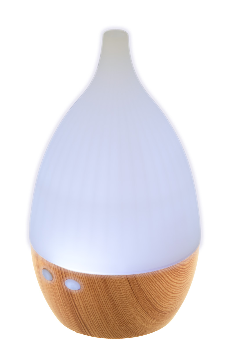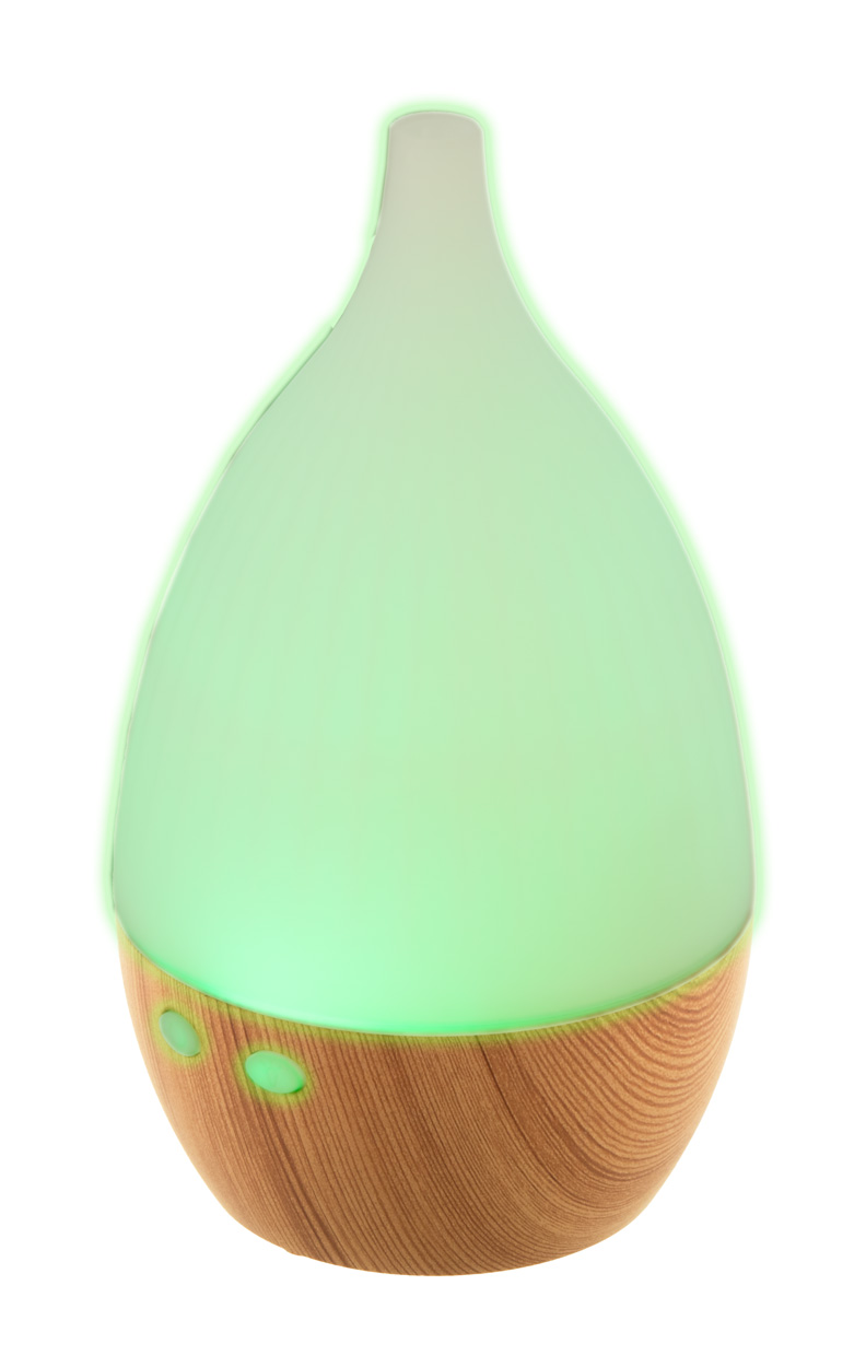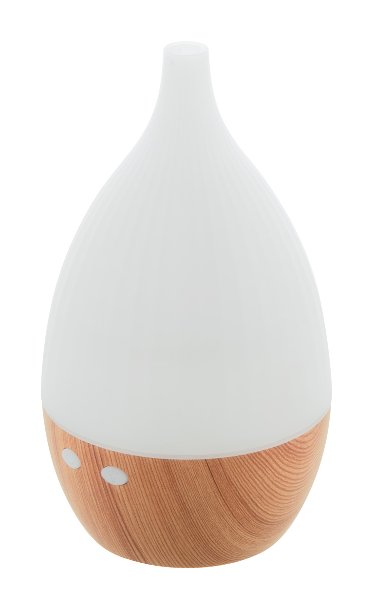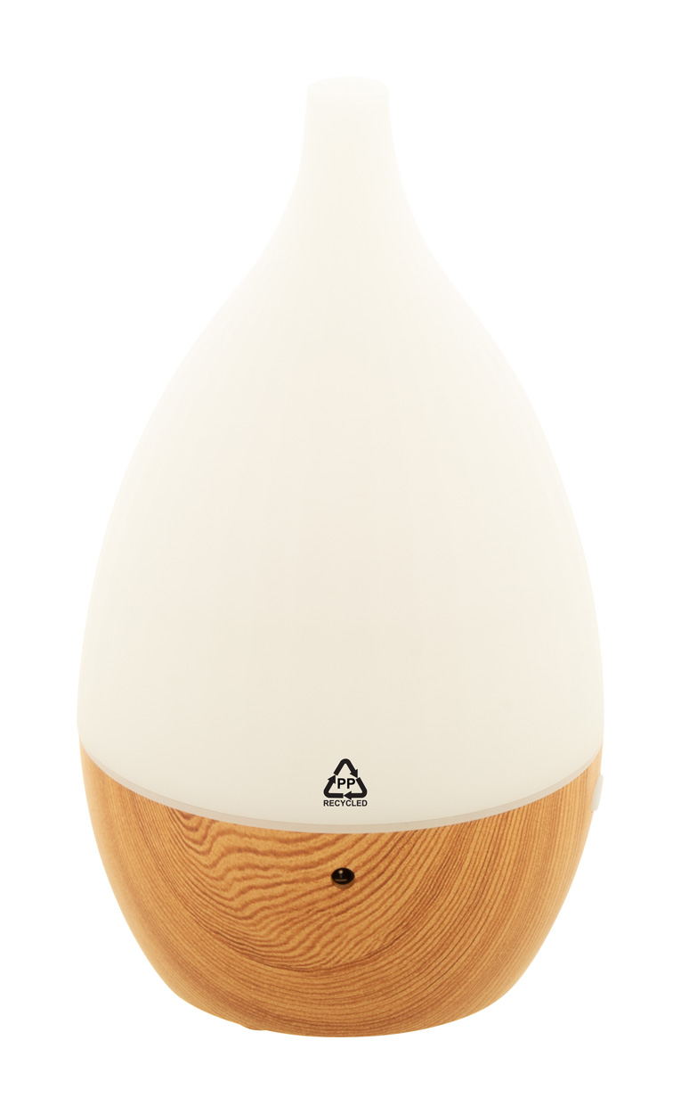 Nawilżacz biurkowy z plastiku PP z recyklingu, z drewnianym wzorem i wielokolorowym podświetlaniem LED. Zawiera kabel zasilający USB. Pojemność zbiornika na wodę: 120 ml.