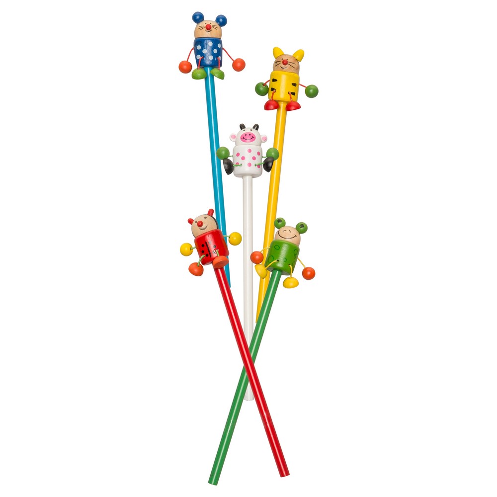 Ołówek „zwierzątko” z kolorowym trzonem, końcówka nie jest naostrzona, występuje w 5 różnych wzorach sprzedawanych losowo: tygrys, biedronka, mysz, żaba i krowa, produkt wykonany z drewna i nylonu
