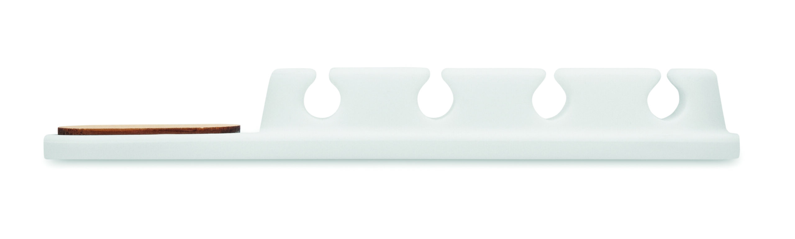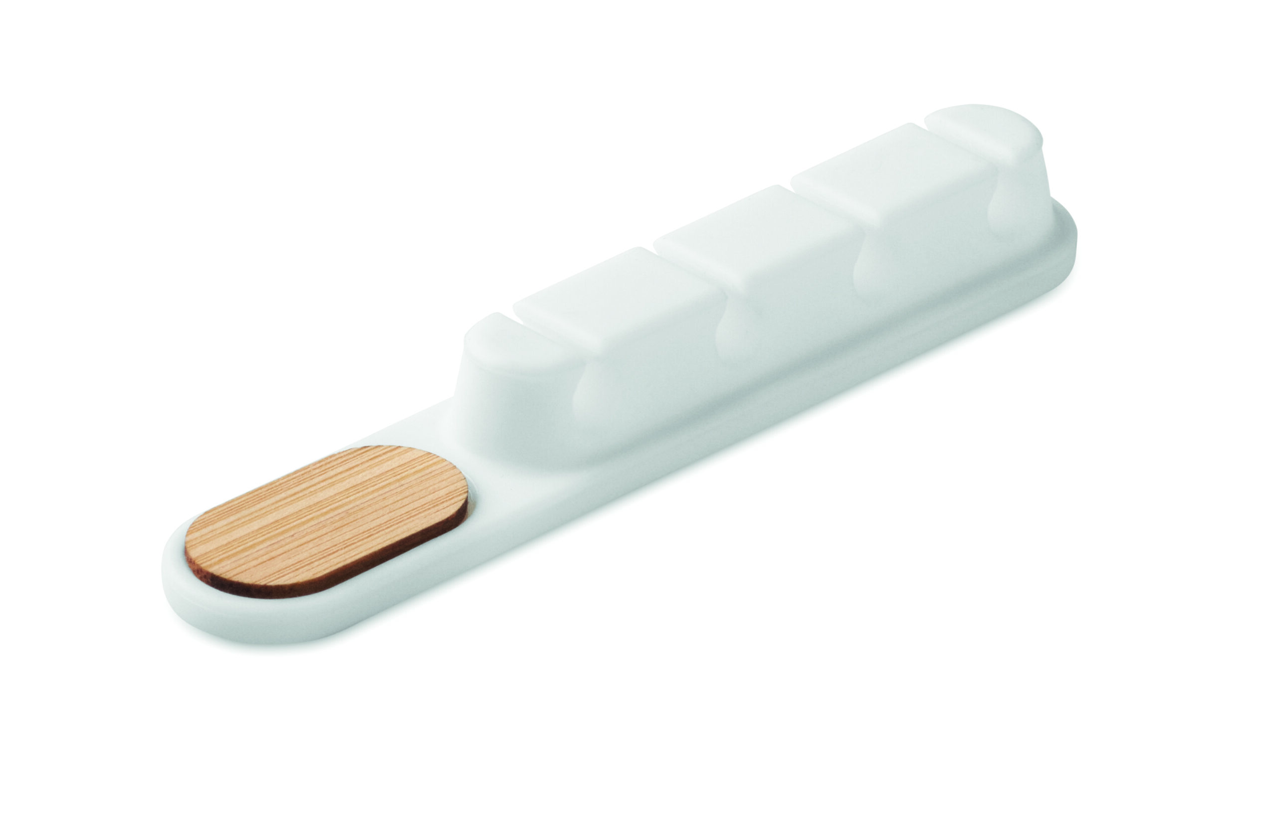 Silikonowy organizer kabli z detalami z naturalnego bambusa. Kompaktowa, owalna konstrukcja zapewnia porządek i bezpieczeństwo kabli.
