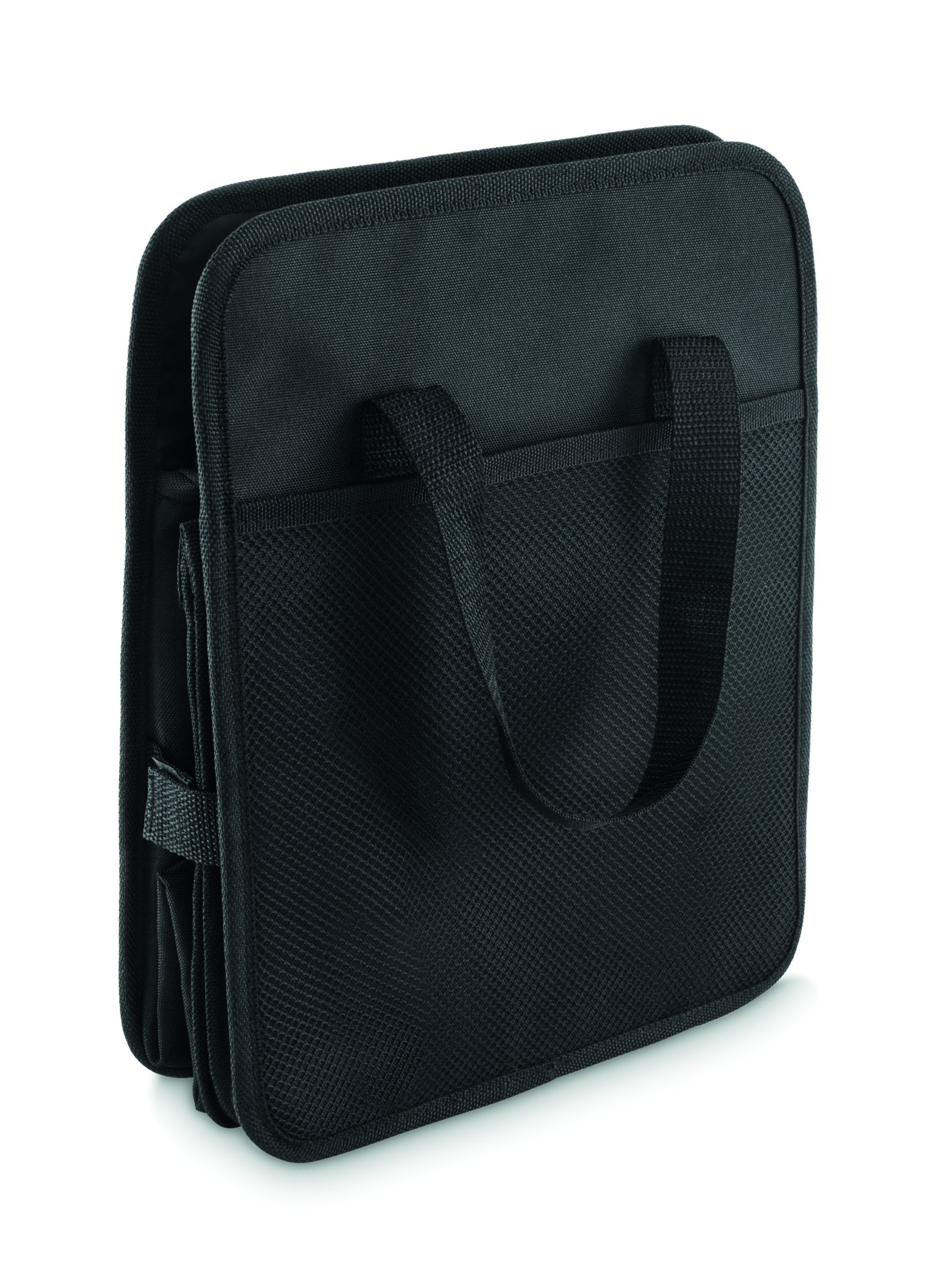 Składany organizer samochodowy z poliestru 600D RPET z 3 przegrodami, w tym jedną przegrodą termiczną.