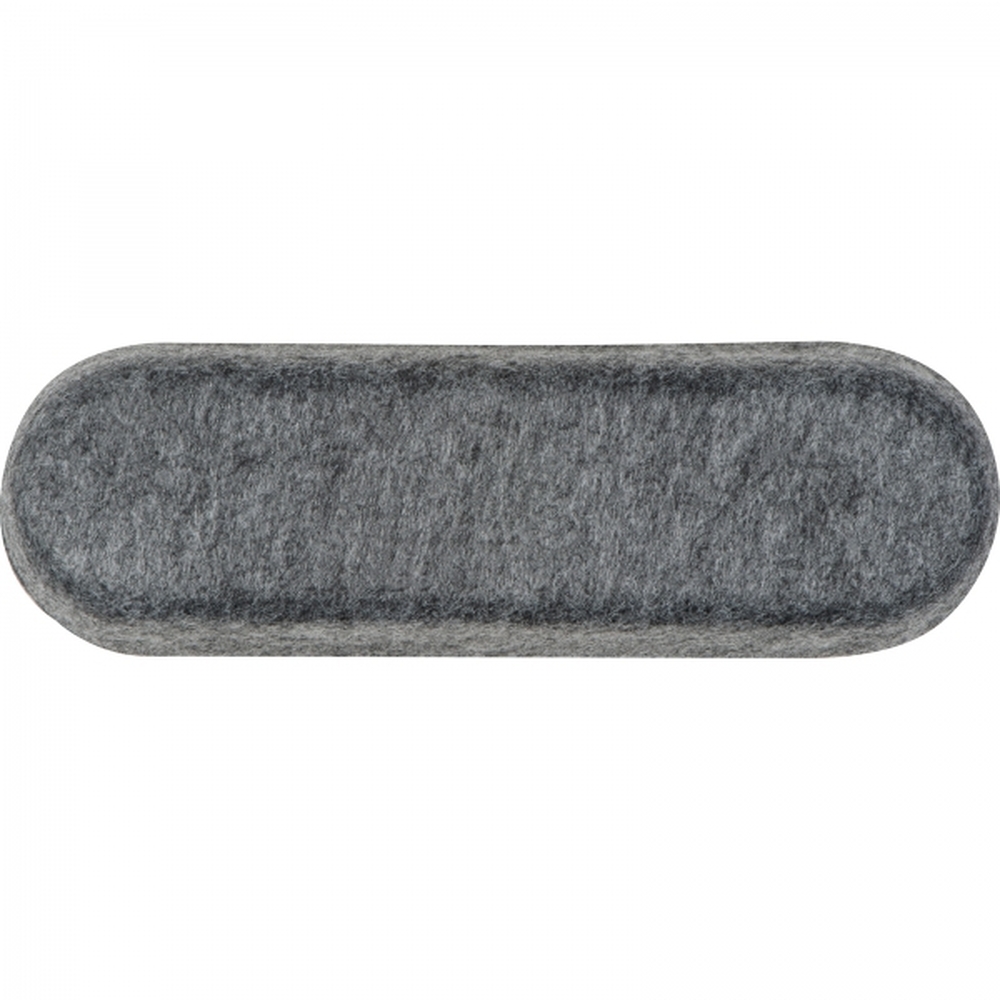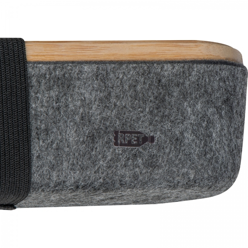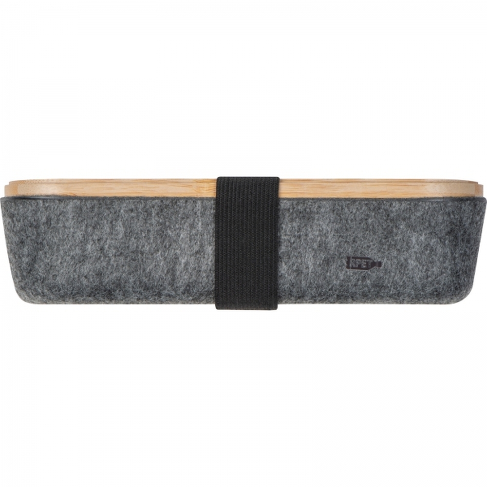 Etui na długopisy wykonane z filcu pochodzącego z recyklingu z bambusową pokrywką, mogącą służyć za podstawkę pod telefon. Pokrywka ma nadrukowaną miarkę. Etui po nałożeniu pokrywki i spięciu gumką może służyć za piórnik.