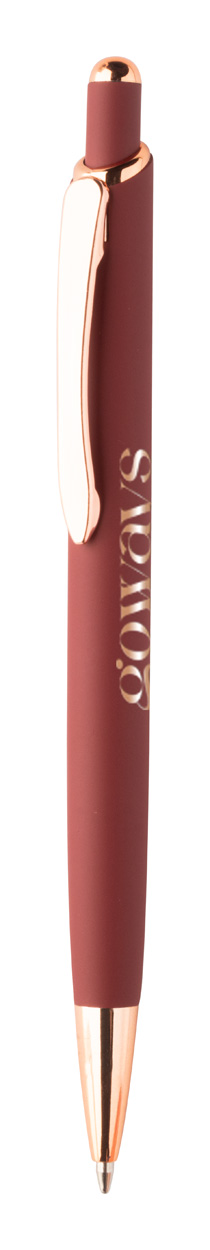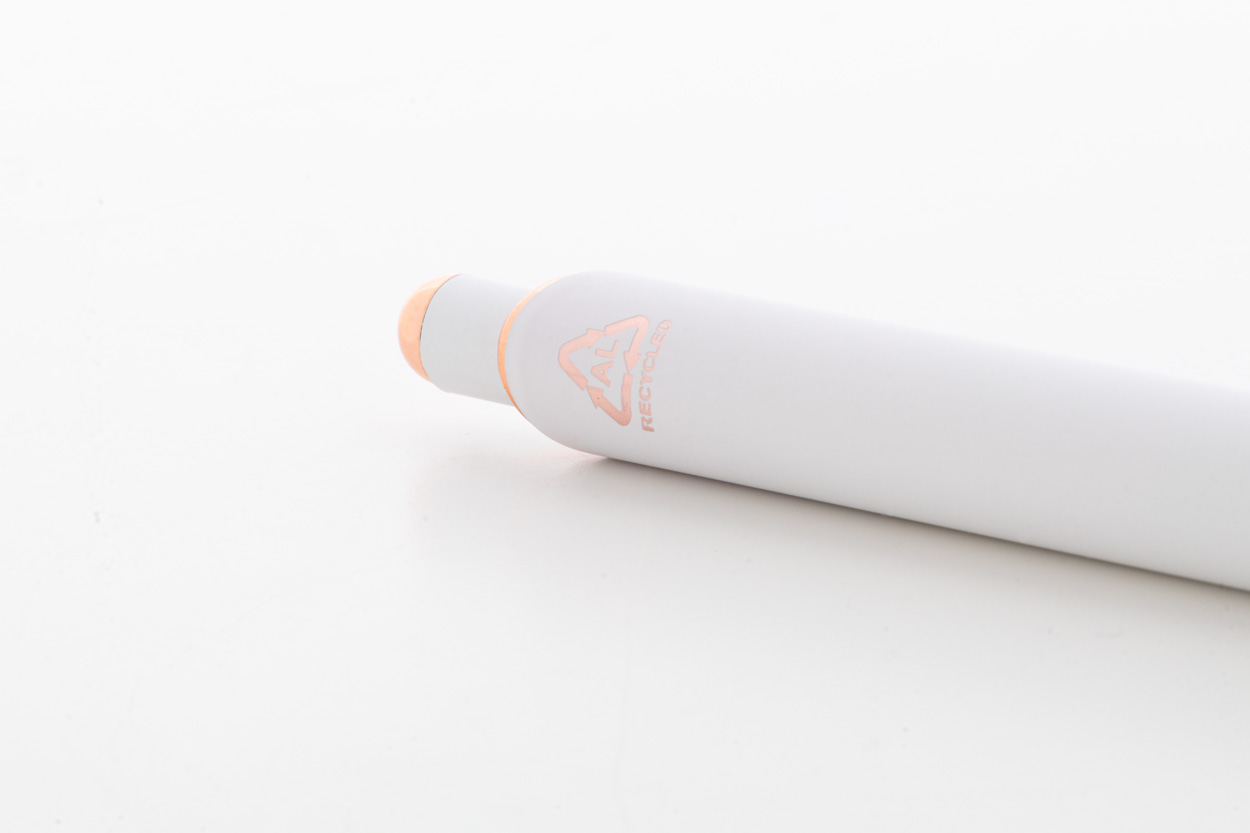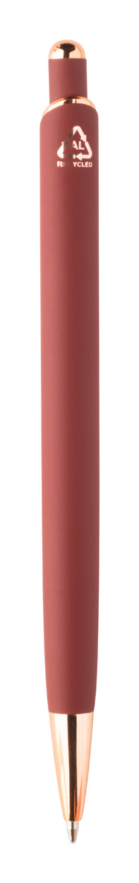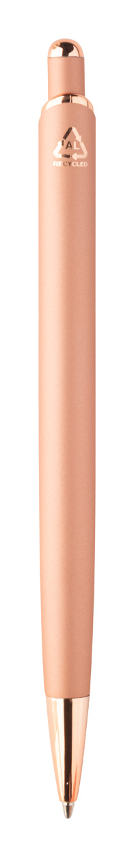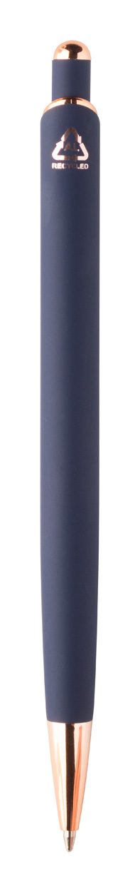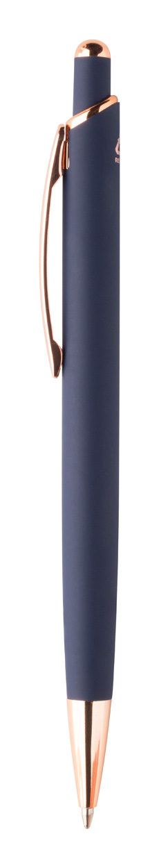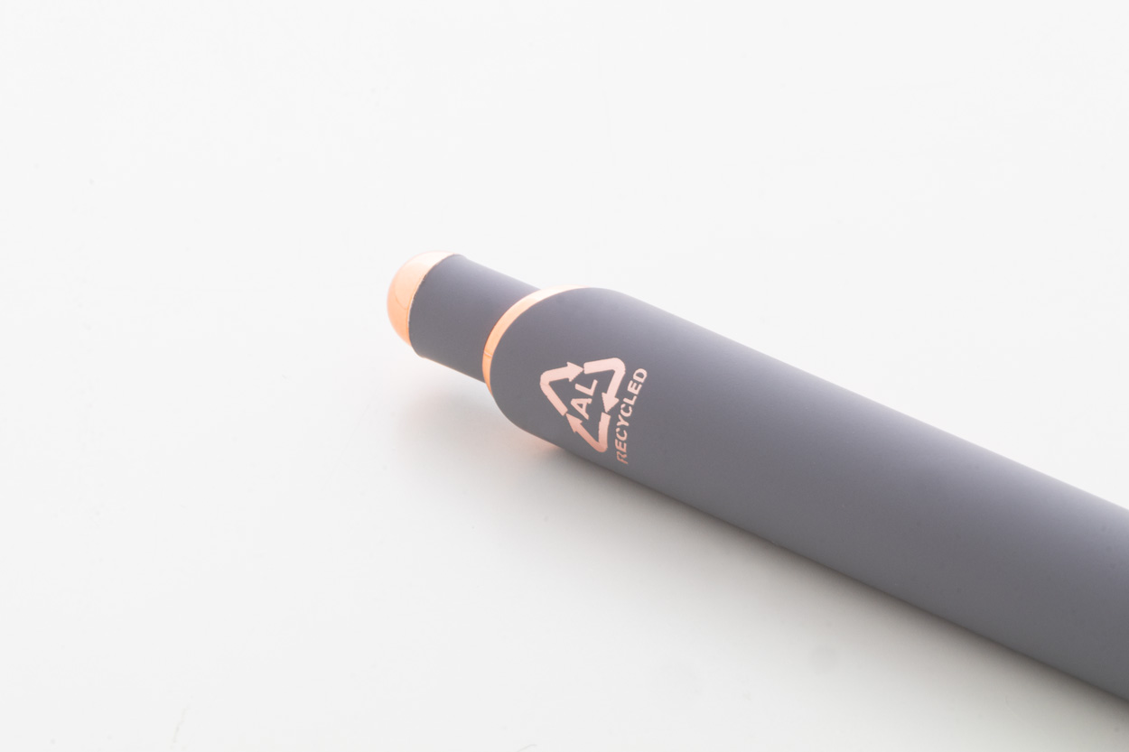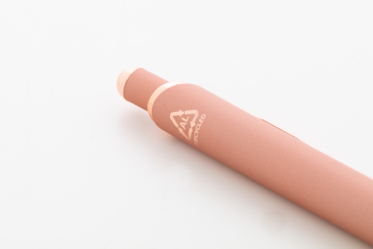 Długopis wykonany z aluminium pochodzącego z recyklingu, z gumowanym wykończeniem i detalami w kolorze różowego złota. Ze specjalną powłoką pod grawer lustrzany w kolorze różowego złota. Z niebieskim wkładem.