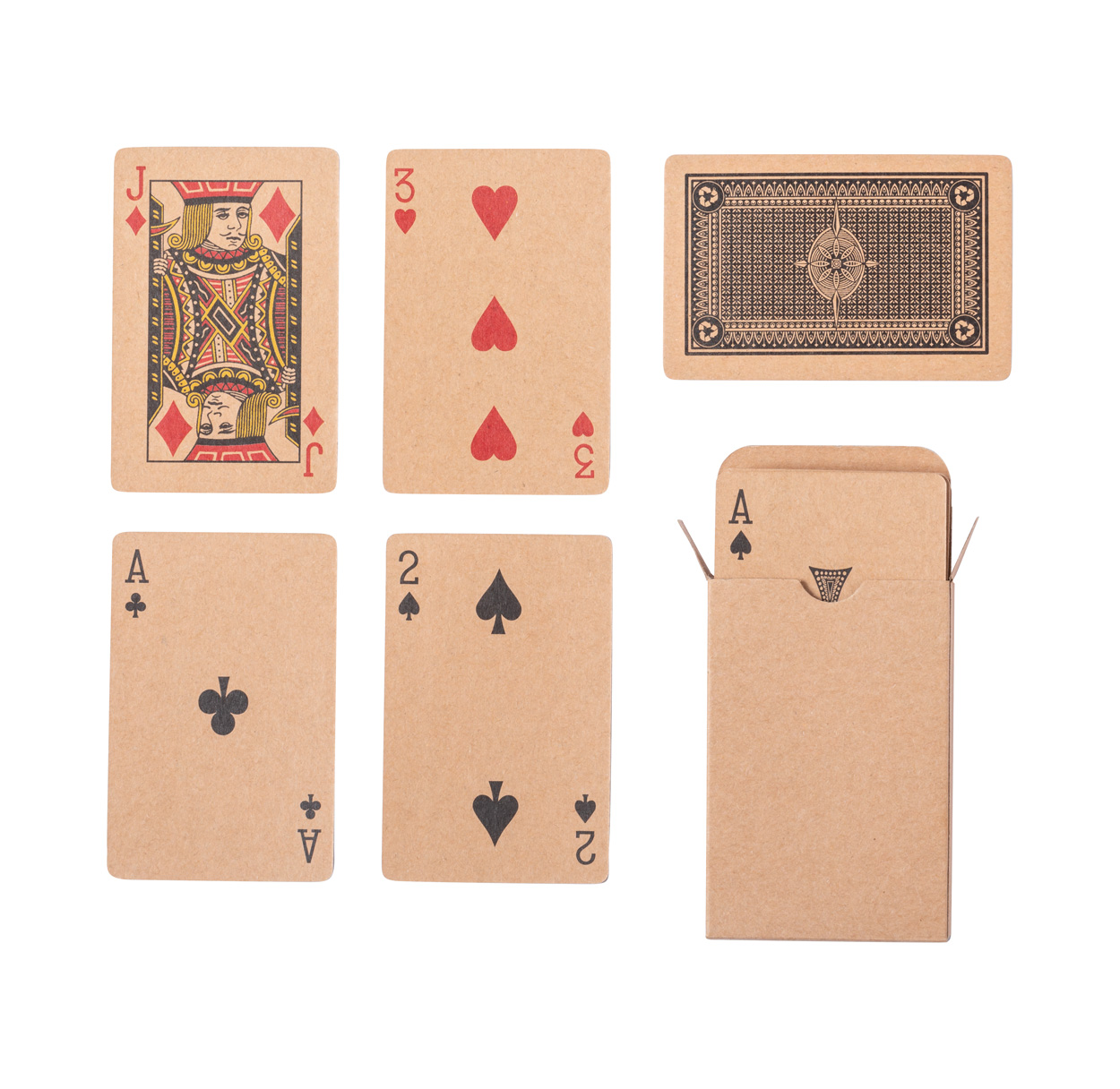 Klasyczne karty do gry z papieru z recyklingu w pudełku z papieru pakowego. Jedna standardowa talia z 54 kartami.