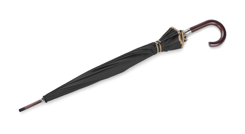 Bardzo elegancki parasol manualny, szesnasto panelowy, zakończony drewnianą zakrzywioną rączką. Wykonany z materiału typu pongee 190 T. Śr czaszy po rozłożeniu to 112 cm, długość złożonego parasola to 90 cm. Szerokość panelu wynosi 22 cm. Nadruk logo wykonamy na czaszy parasola metodą sitodruku.
