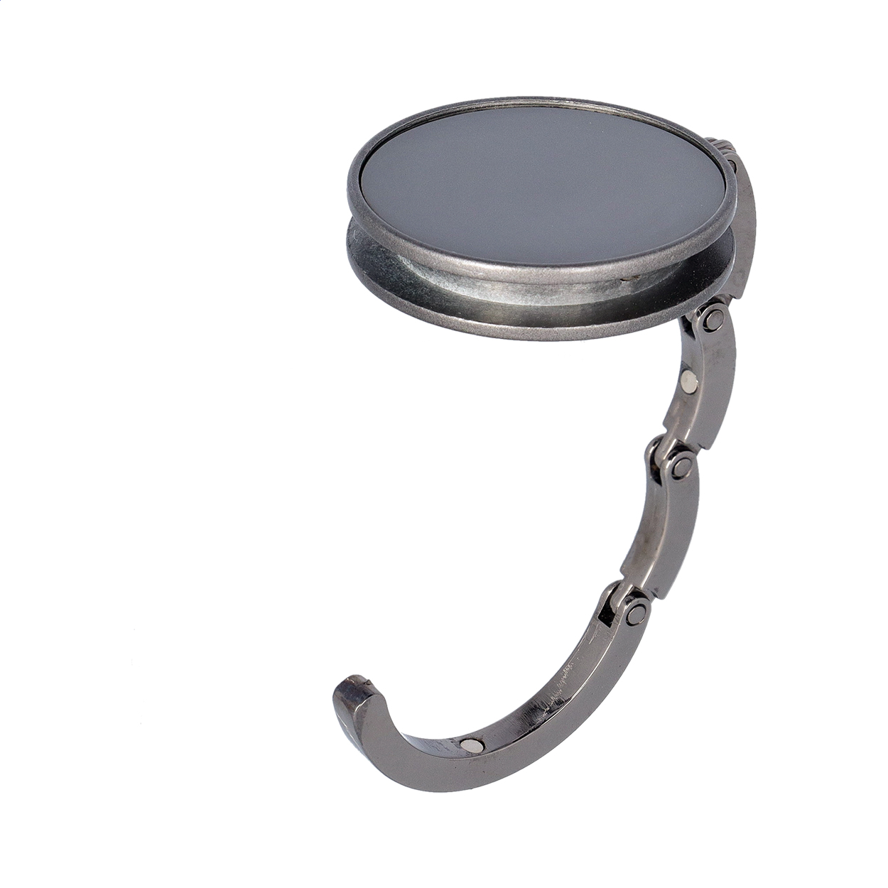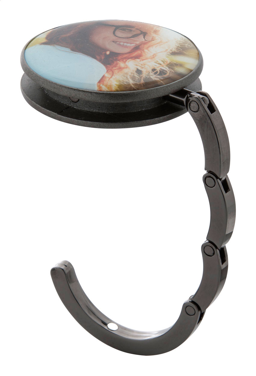 Metalowy wieszak na torebki z metalicznym wykończeniem. Magnetyczne zamykanie.