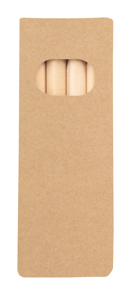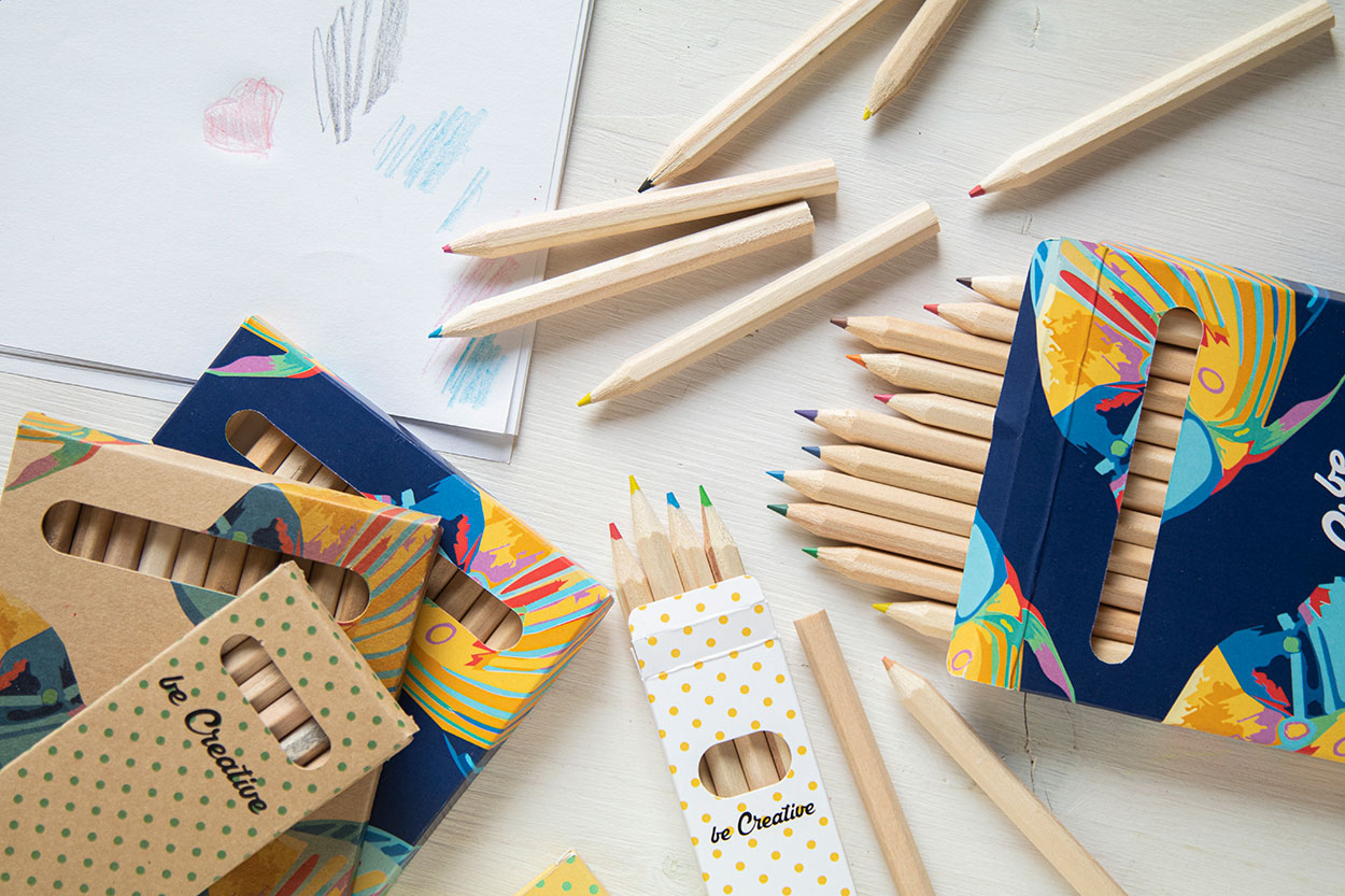 Drewniane kredki (4 szt.) w kartoniku z full kolorowym nadrukiem. Cena obejmuje nadruk cyfrowy. Min. ilość: 100 szt.