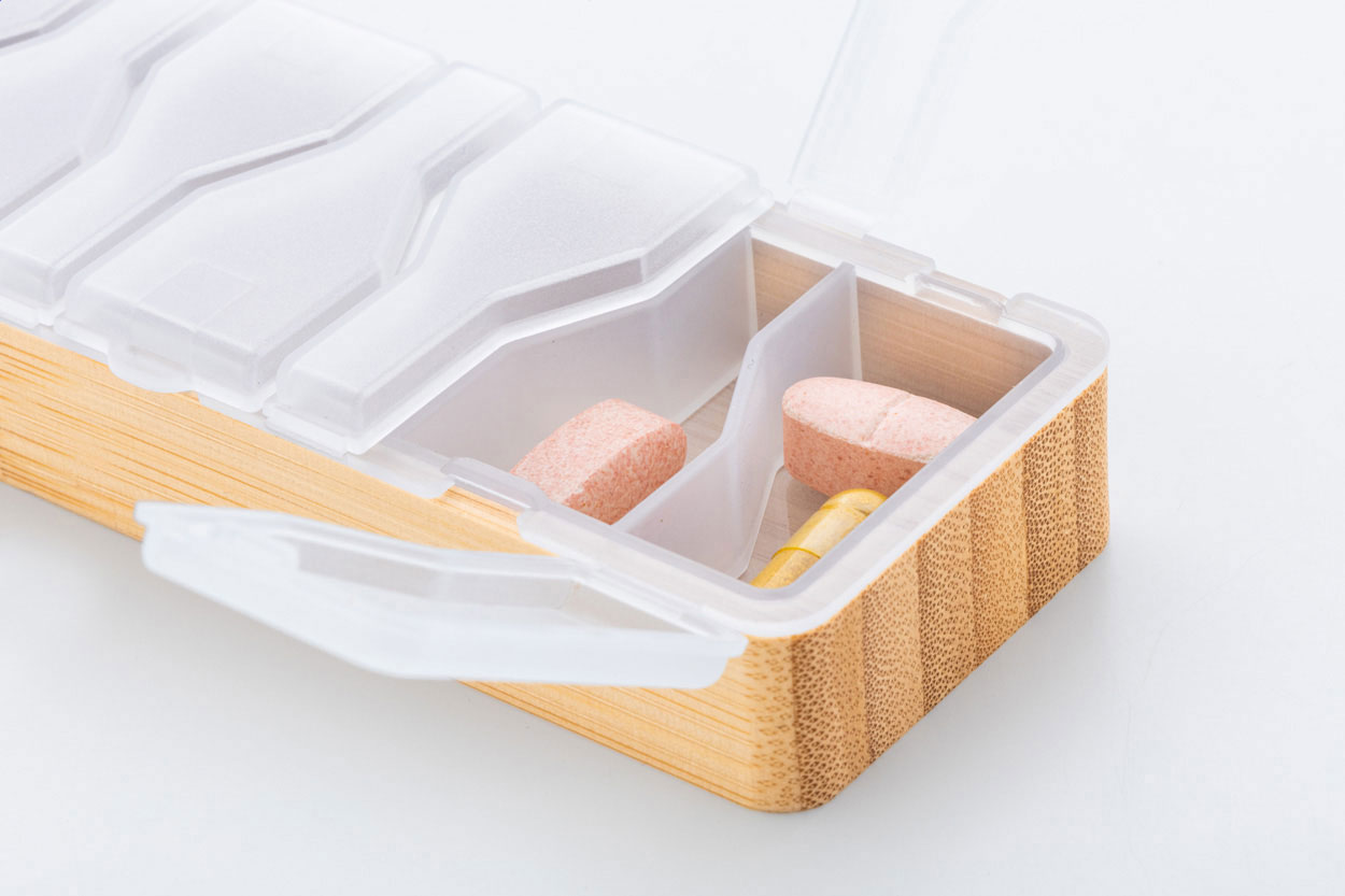Pojemnik na tabletki, wykonany z bambusa i plastiku PP, z 7 przegródkami na każdy dzień tygodnia.