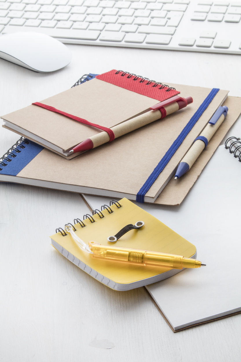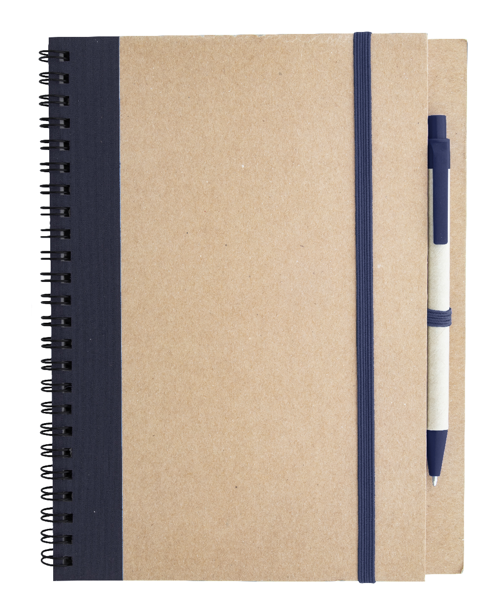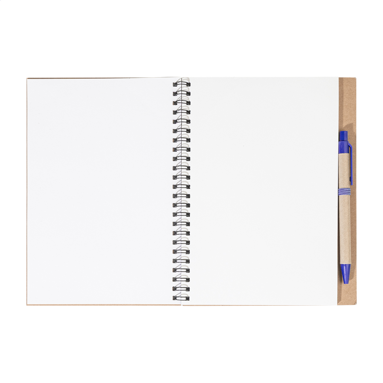 Spiralny notes z papieru z recyklingu z 60 gładkimi kartkami i długopisem z papieru.