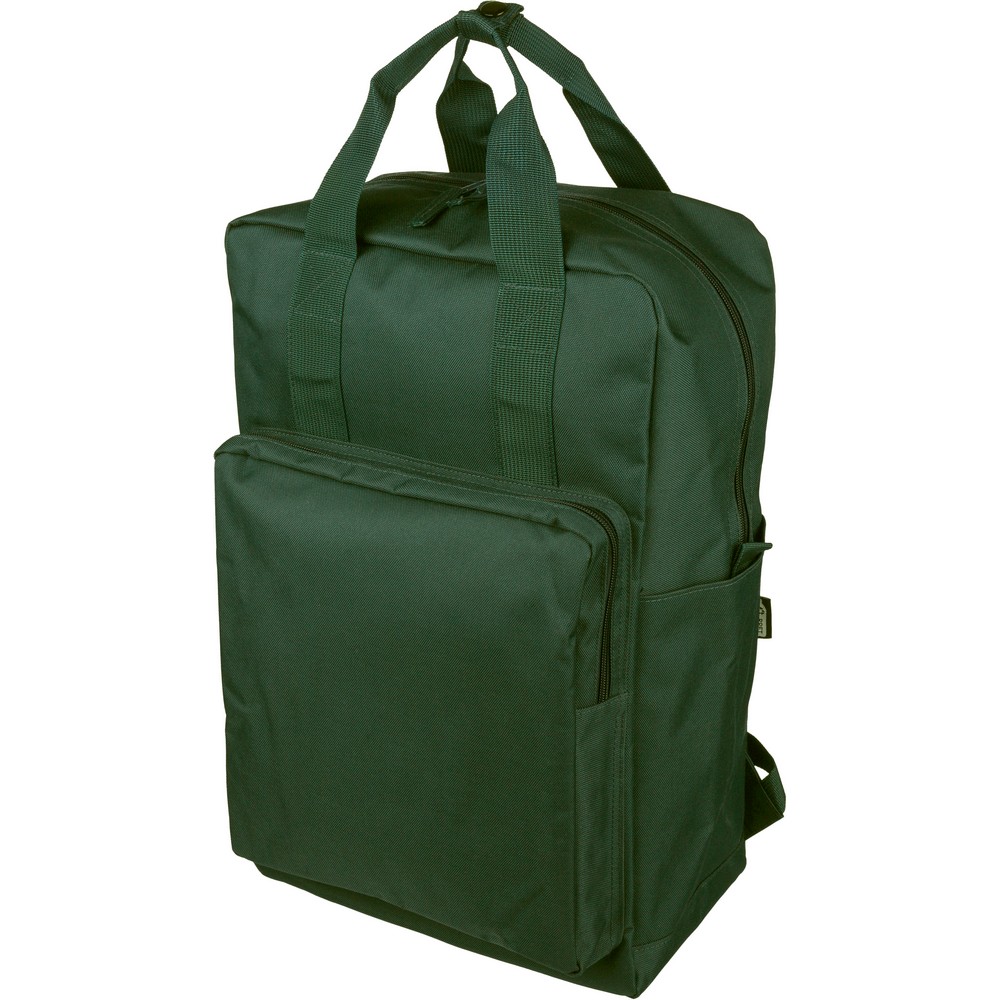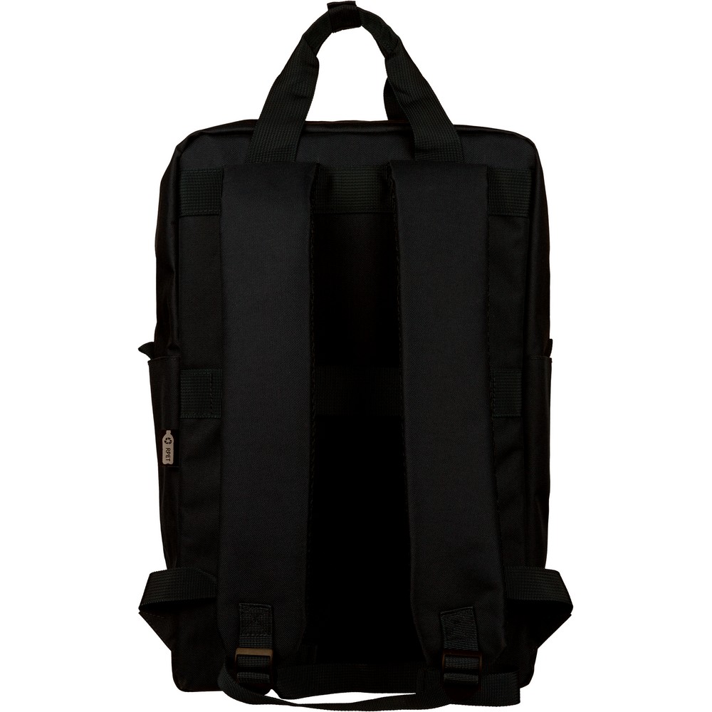 Plecak, podszewka z poliestru 210D, główna kieszeń zapinana na zamek, wewnętrzna przegroda na laptopa 16″, mniejsza przednia kieszeń zapinana na zamek, regulowane i wentylowane paski do noszenia, pasek do przymocowania do walizki, kieszenie boczne po obu stronach, produkt wykonany z poliestru 600D z recyklingu