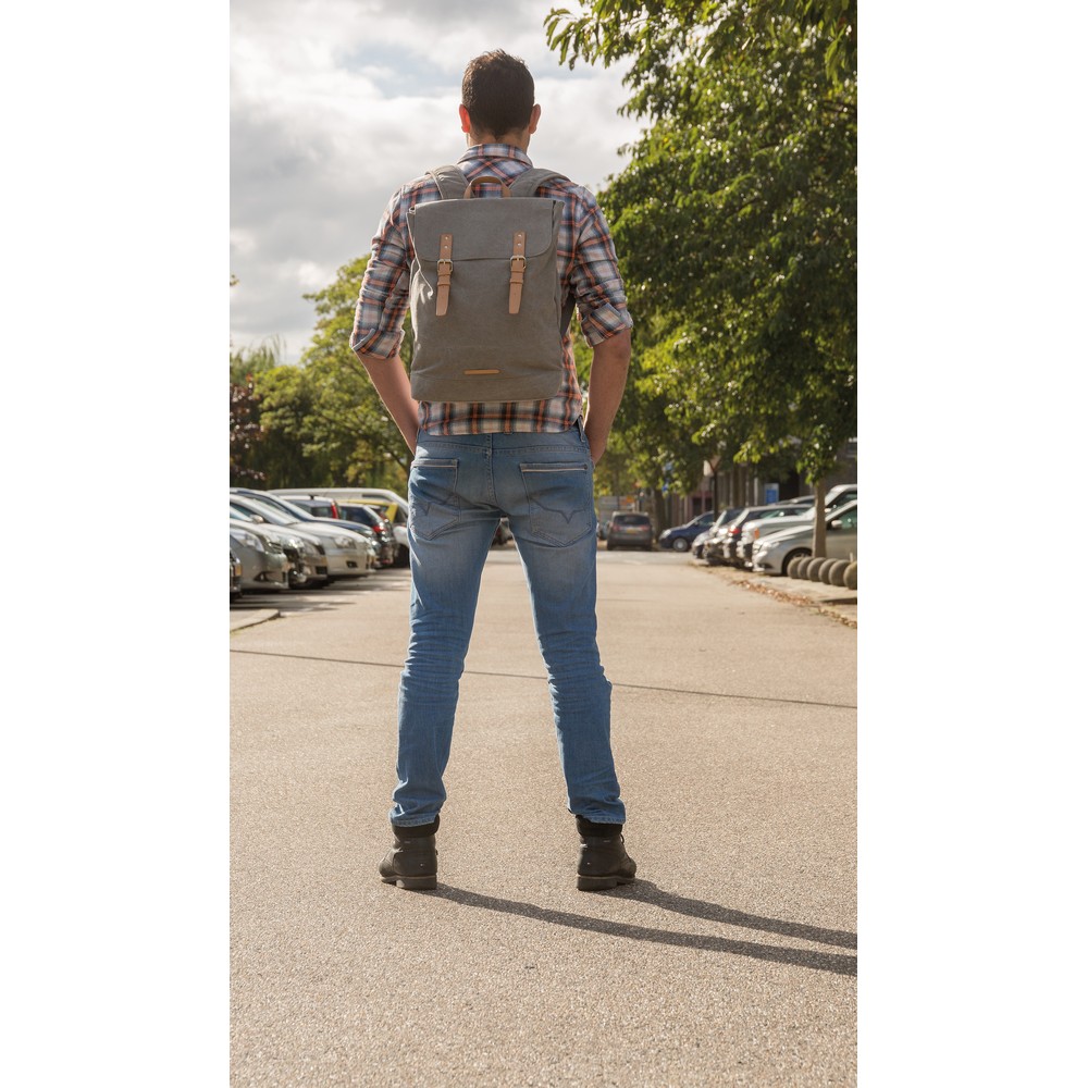 Plecak z miękką przegrodą na laptopa 15,6″, wykonany z wytrzymałego płótna, pokrywa górna zamykana na paski z magnetycznymi klamrami, nie zawiera PVC, ślad węglowy produktu: 8,47 kg CO2