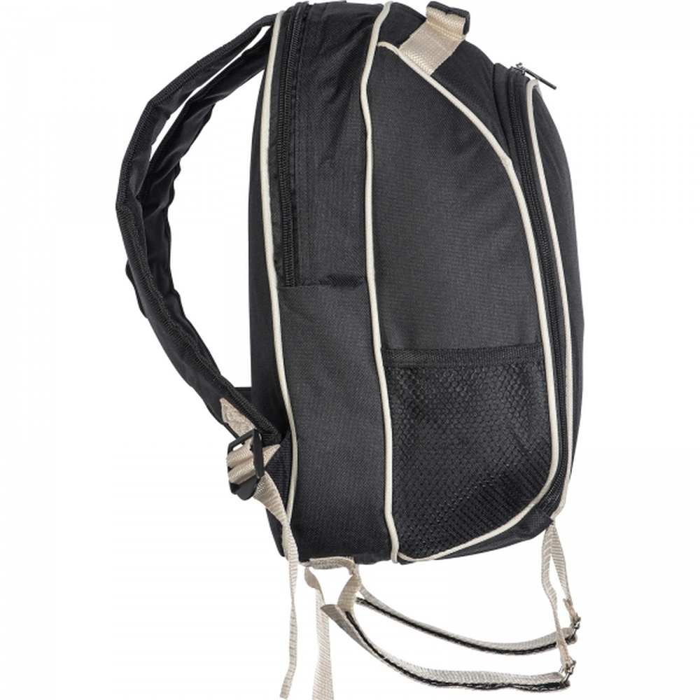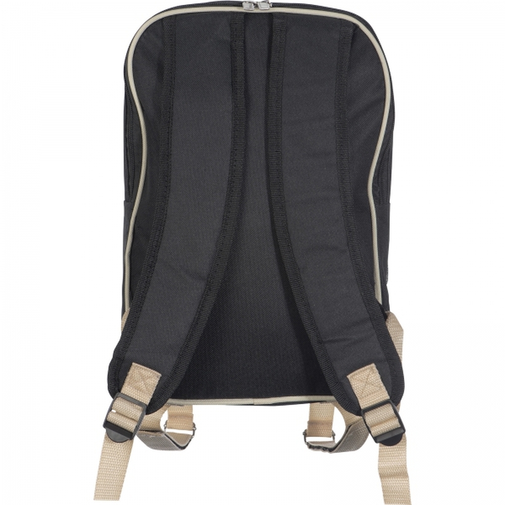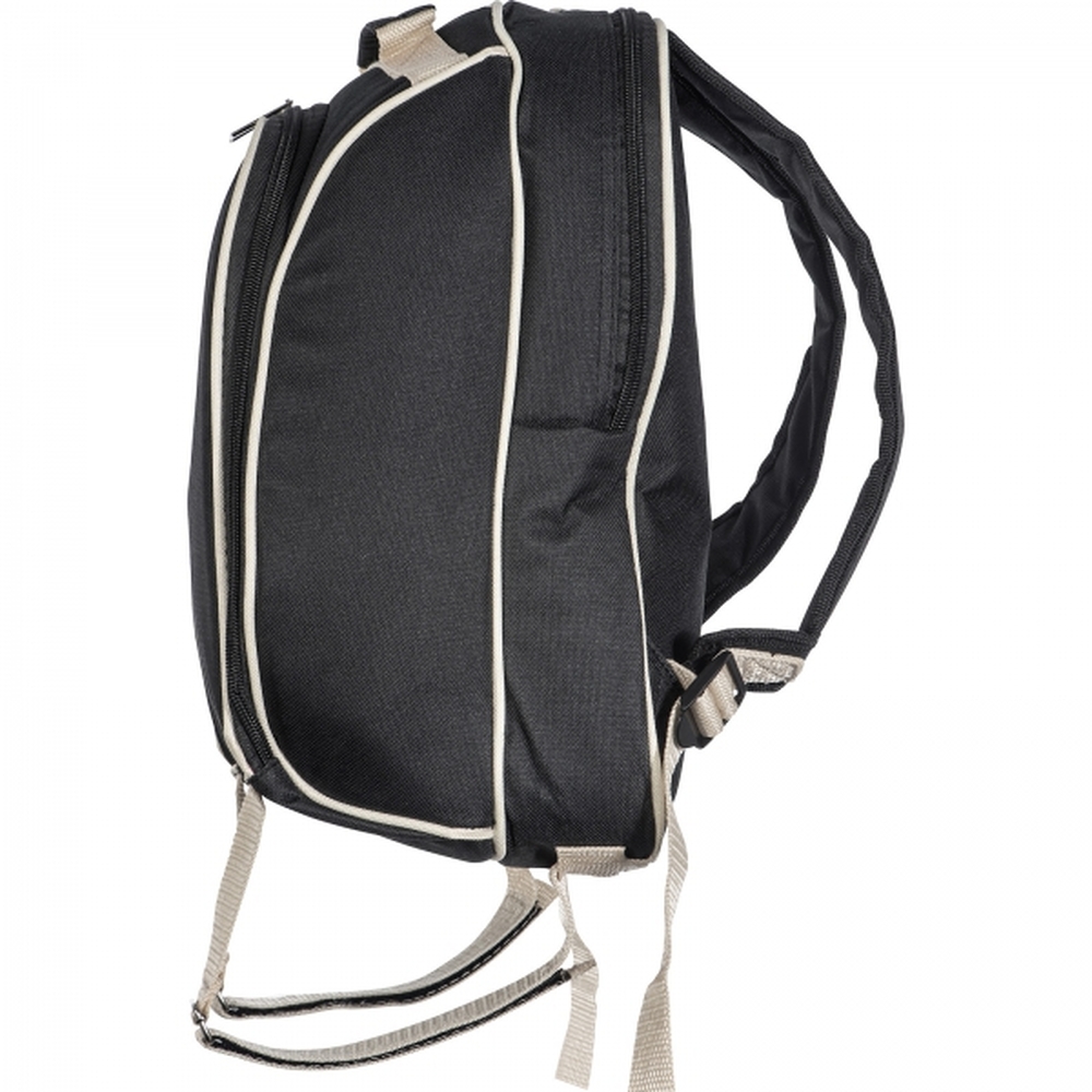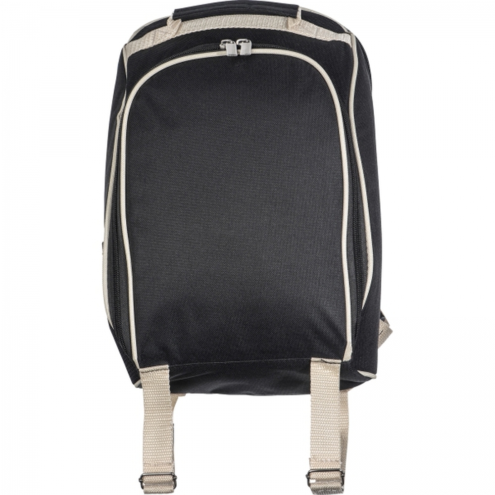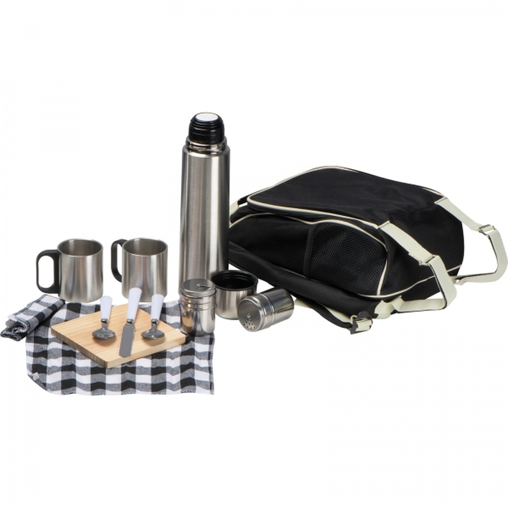 Plecak piknikowy z wytrzymałego poliestru z przegrodą chłodzącą. Zawiera wyposażenie dla 2 osób: termos ze stali nierdzewnej, dwa stalowe kubki, pojemniki na sól i pieprz, małą deskę, sztućce i serwetkę.