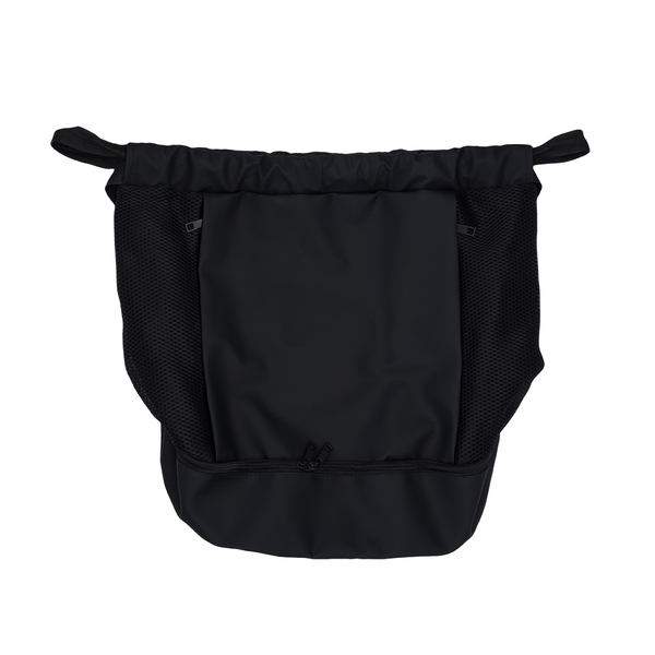 Pojemny plecak ze ściągaczem, wykonany z miękkiego PU. Posiada przegrodę na buty zapinaną na suwak, kieszonki boczne oraz szerokie paski.