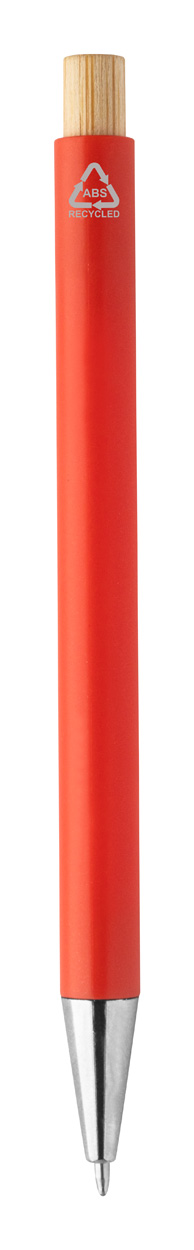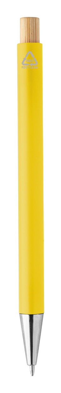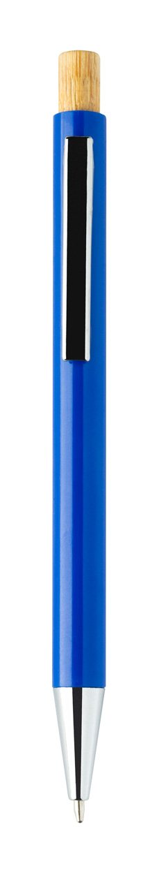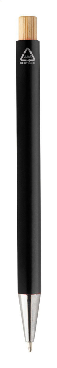 Długopis z tworzywa sztucznego ABS z recyklingu z bambusowym przyciskiem i metalowym klipem. Z niebieskim wkładem.