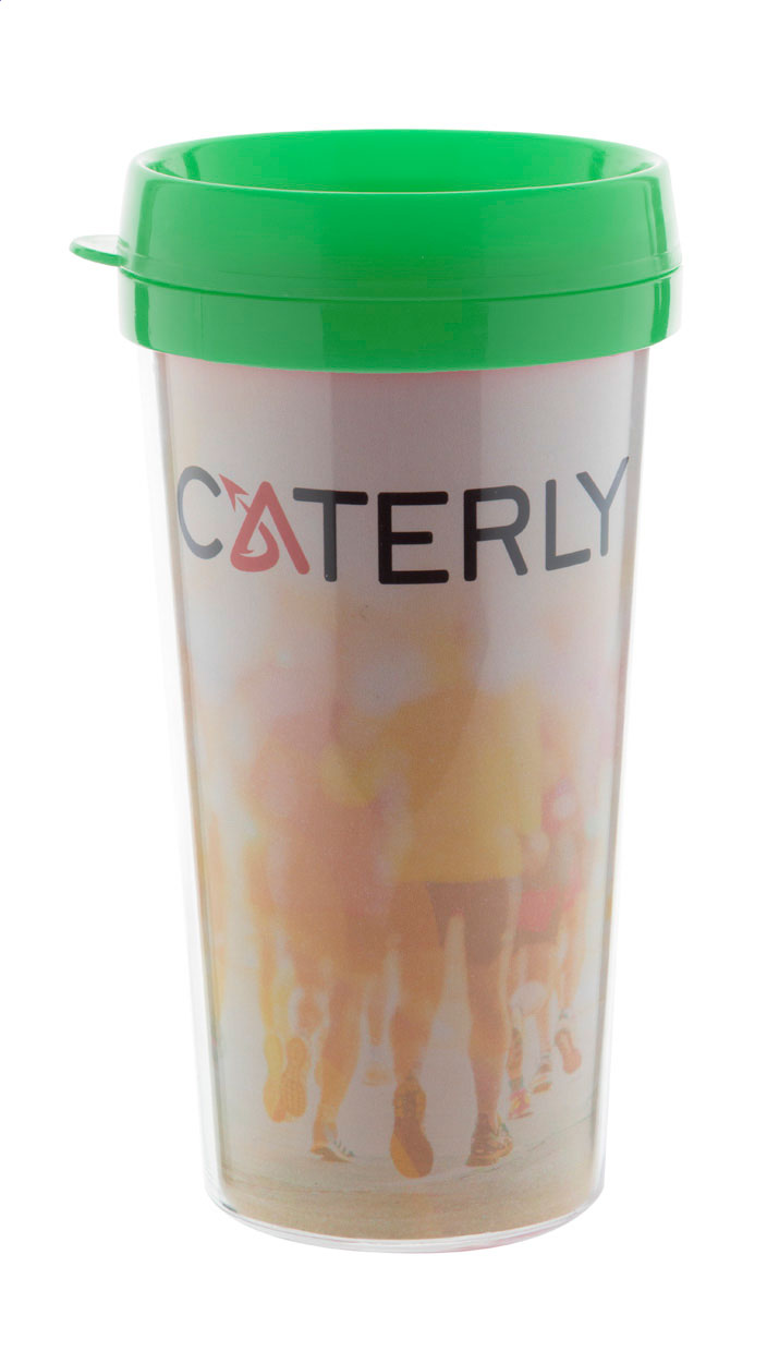 Plastikowy kubek termiczny z podwójną ścianką. Pomiędzy ściankami można umieścić spersonalizowany wydruk. 450 ml. W białym kartoniku.