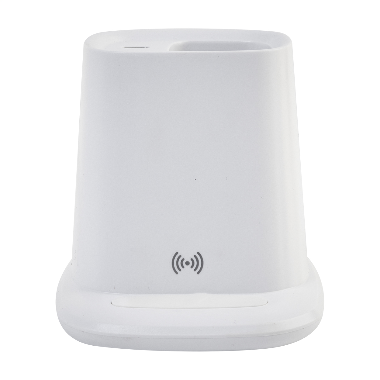 Wielofunkcyjny uchwyt na długopisy z recyklingowanego ABS z uchwytem na telefon, wbudowaną szybką ładowarką bezprzewodową (10 W), 1 portem USB i 1 portem USB-C. W zestawie kabel USB do ładowania.