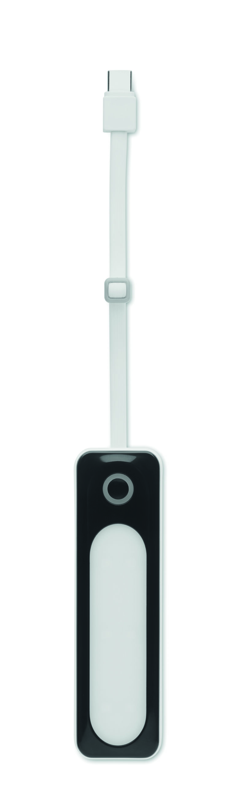 Power bank o pojemności 5000 mAh w obudowie ABS. Wyjście DC5V/2A 1x typ A i 1x typ C wejście/wyjście. Zawiera 4 wskaźniki świetlne (6 diod LED COB) i zintegrowany kabel USB z wtyczką typu C.