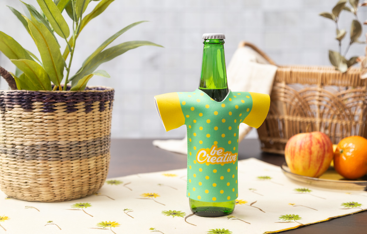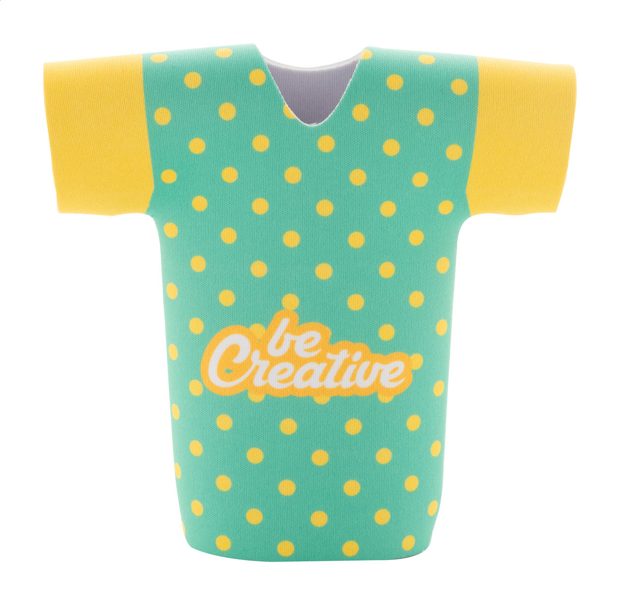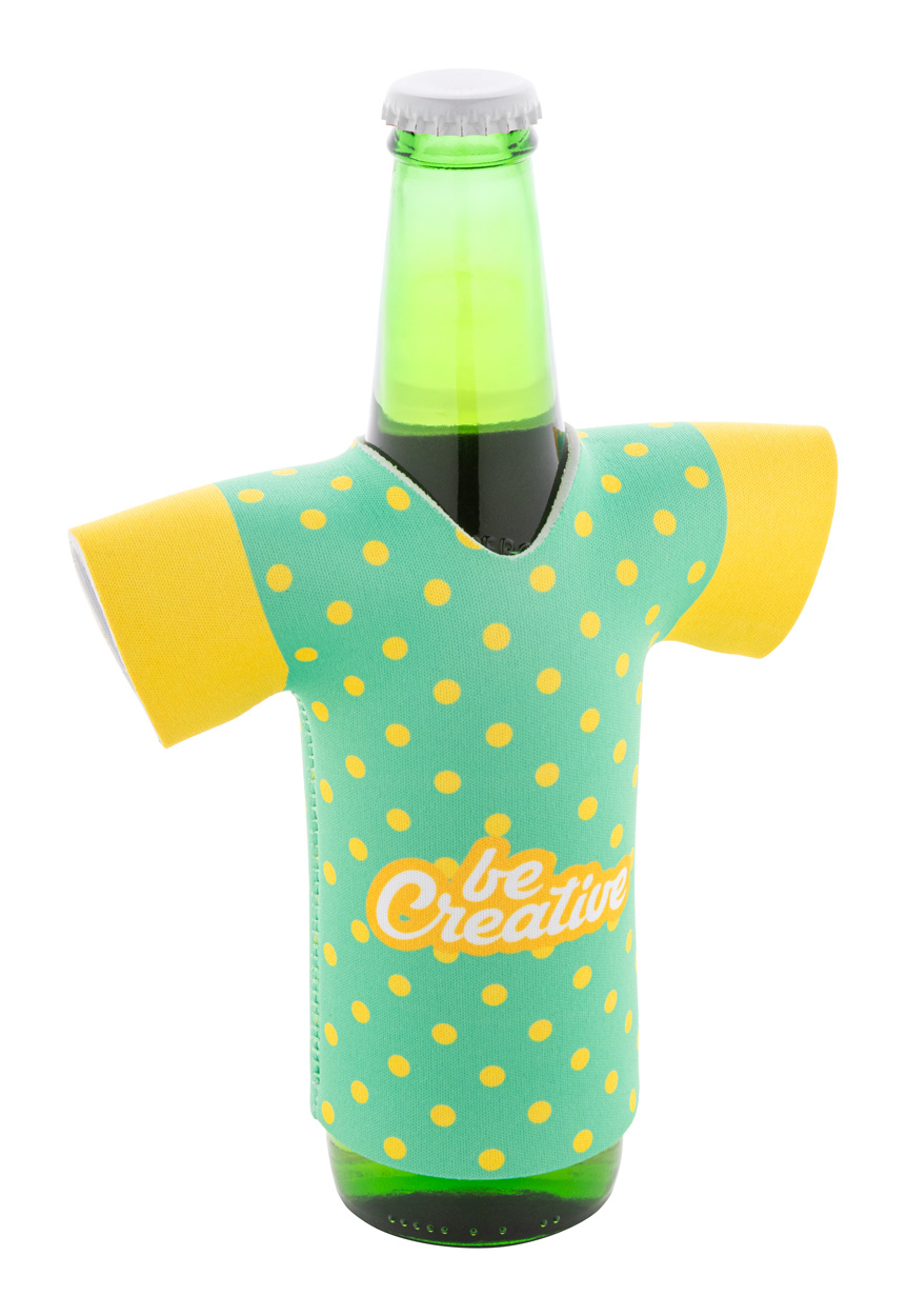 Wykonana na zamówienie, neoprenowa osłona chłodząca RPET na butelkę piwa w kształcie koszulki. Z nadrukowaną grafiką sublimacyjną na całej powierzchni. Min. ilość: 50 szt.