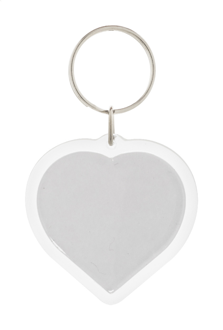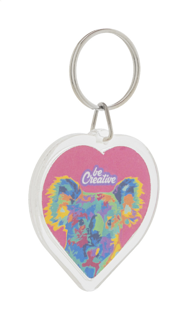 Brelok z akrylu w kształcie serca z personalizowaną wstawką z full kolorowego papieru i metalowym kółkiem. Cena zawiera nadruk cyfrowy po obu stronach. Min. ilość: 100 szt.