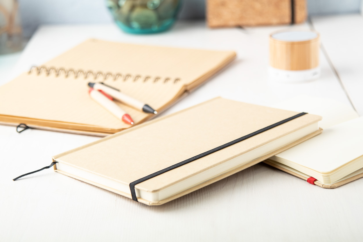 Notes w kartonie z recyklingu. Posiada 100 czystych kartek, kolorową zakładkę i gumkę.