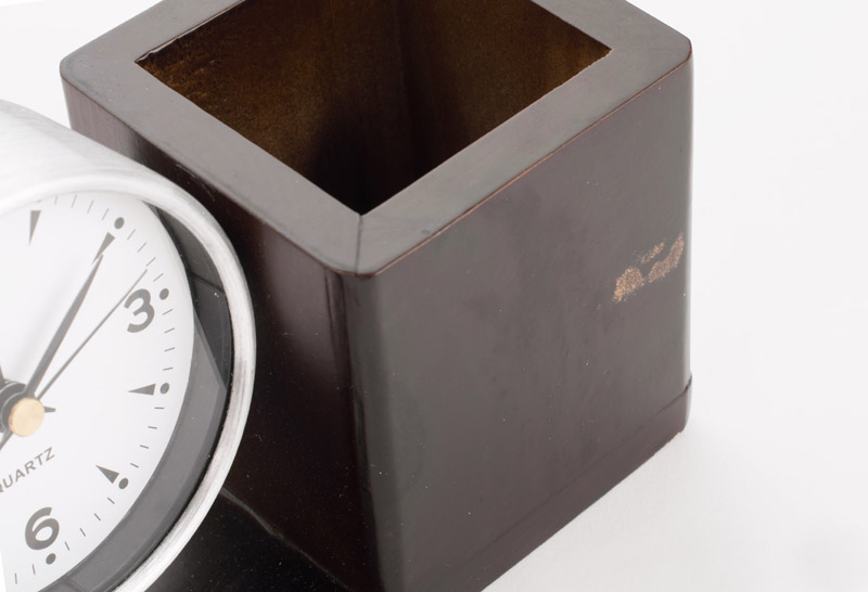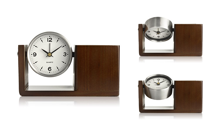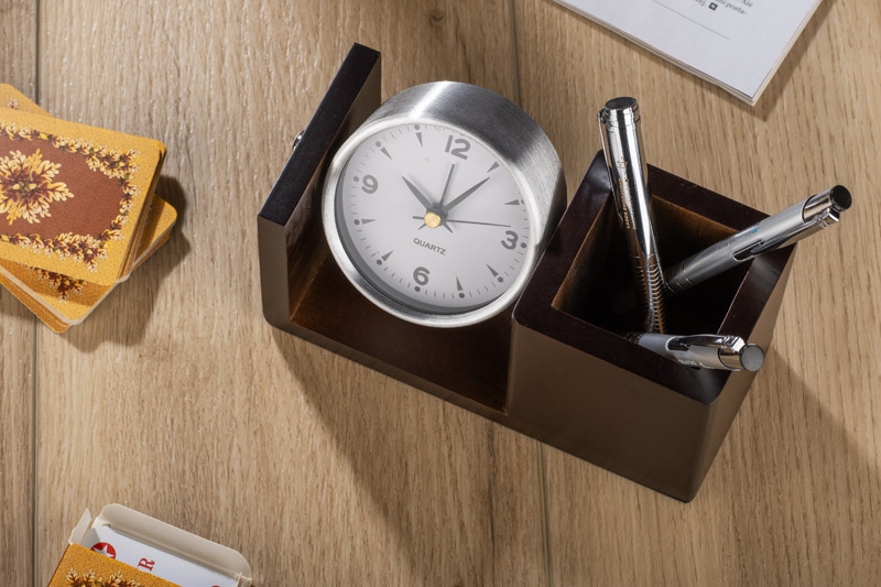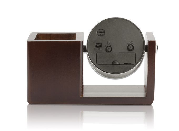 Metalowy zegar z budzikiem i dużą białą tarczą jest zamocowany na eleganckiej drewnianej podstawce z litego drewna. Zestaw jest wyposażony w pojemnik na artykuły biurowe. Zegar można obracać w górę i w dół. Zegar będzie cenioną ozdobą każdego biurka ze względu na połączenie estetyki z funkcjonalnością. Znakowanie możliwe na drewnianej części przeznaczonej na artykuły biurowe.