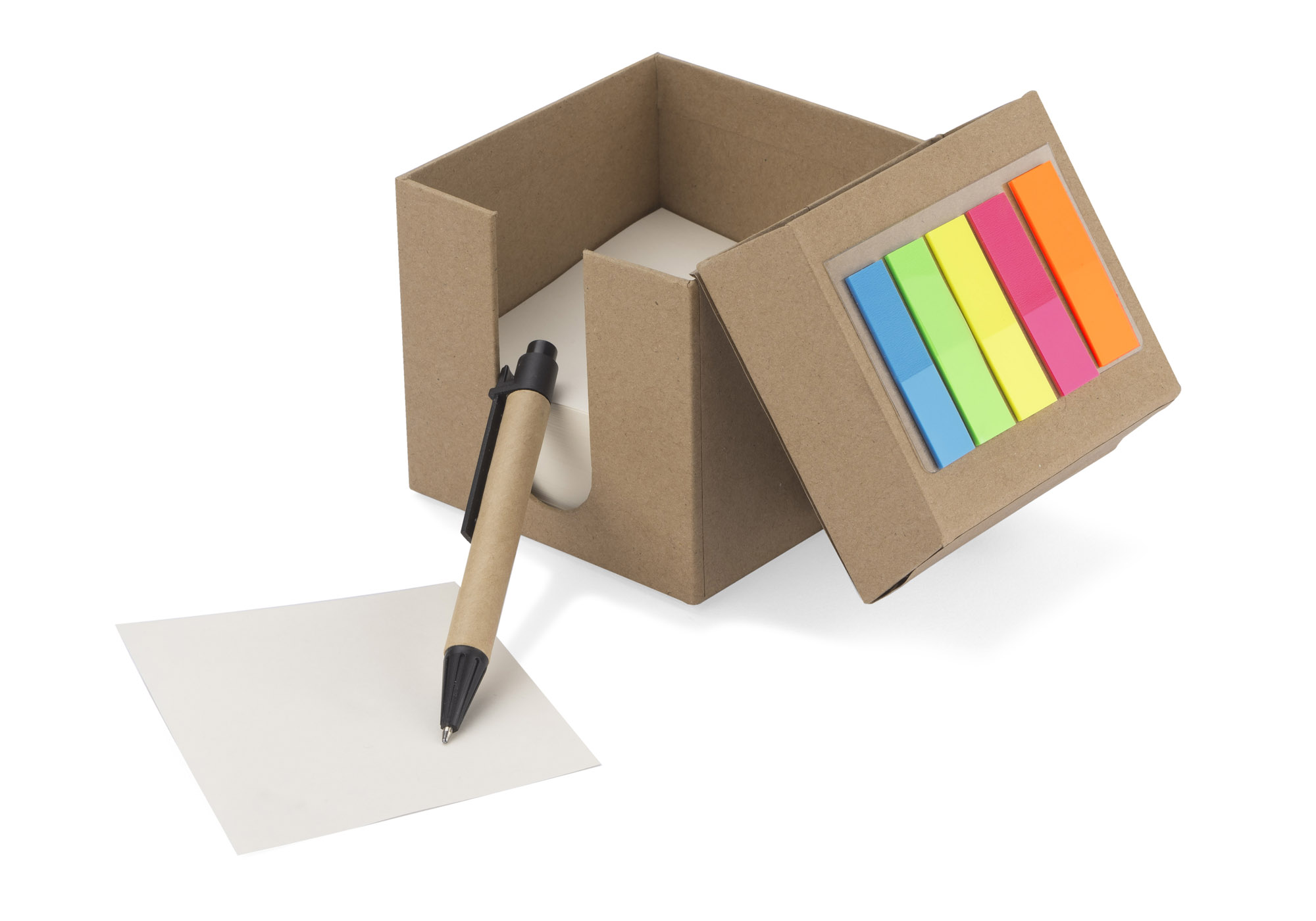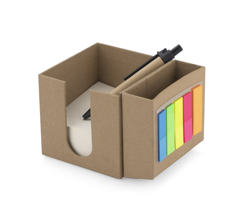 Oryginalny zestaw karteczek w tekturowej kostce – zestaw ten można rozłożyć do formy wygodnego stojaka na biurko. W środku znajduje się zestaw białych karteczek biurowych, pojemnik na artykuły piśmiennicze oraz kolorowe zakładki samoprzylepne z tworzywa PET. Tworzywo PET użyte do produkcji zakładek sprawia, że znacznie lepiej kleją się do kartek i są trwalsze w porównaniu do zakładek papierowych. Jeżeli szukasz funkcjonalnego produktu, który jednocześnie jest ekologiczny to jest to idealny wybór. W zestawie długopis. Znakowanie jest możliwe na opakowaniu.