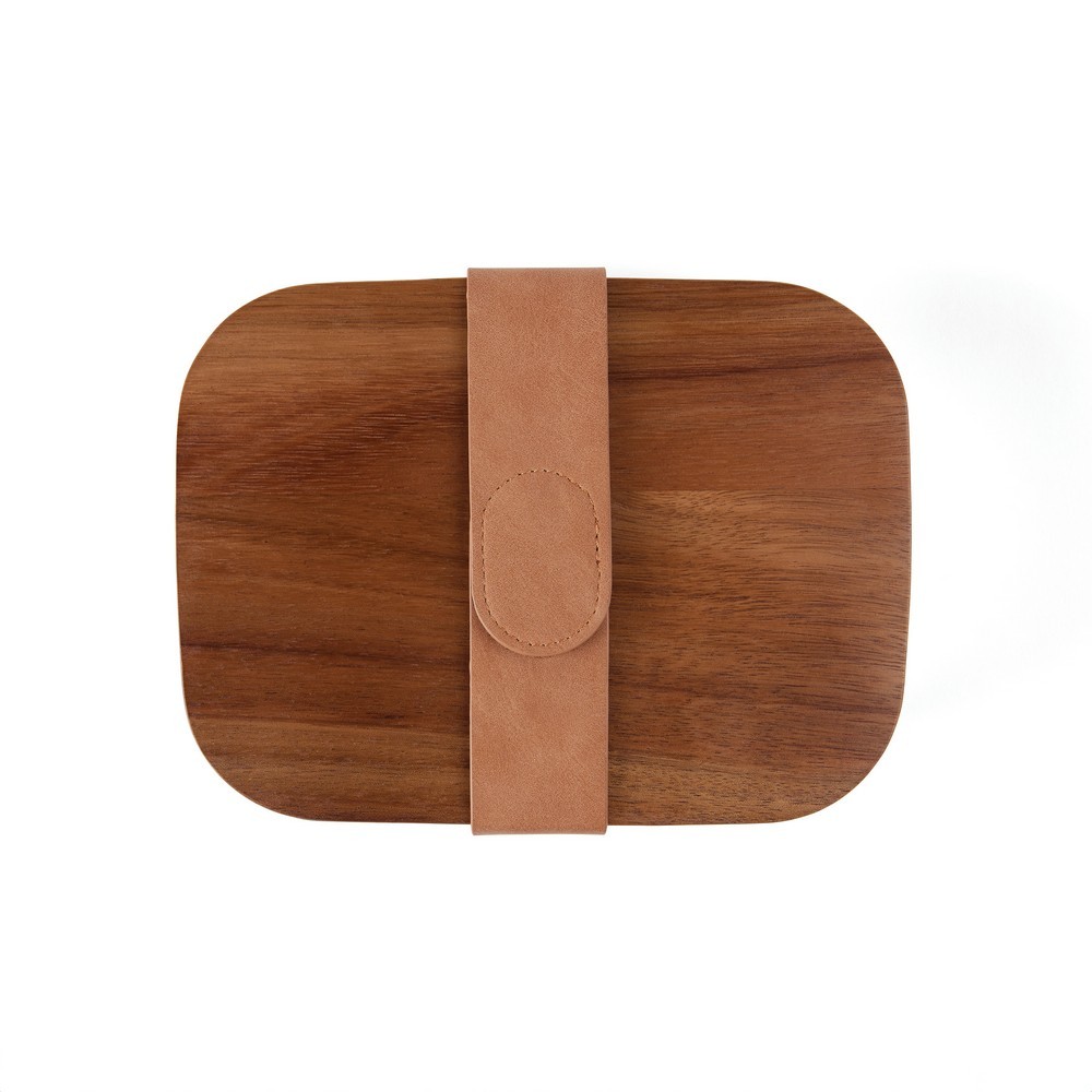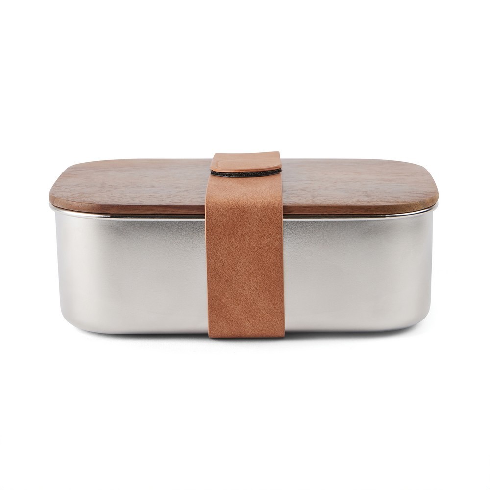 Pudełko śniadaniowe, lunchbox, drewniana pokrywka, pasek na rzep, wykonane ze stali nierdzewnej z recyklingu, całkowita zawartość materiałów z recyklingu obliczona na podstawie wagi całkowitej przedmiotu: 40%, wyłącznie mycie ręczne, w pudełku z papieru kraftowego z certyfikatem FSC®