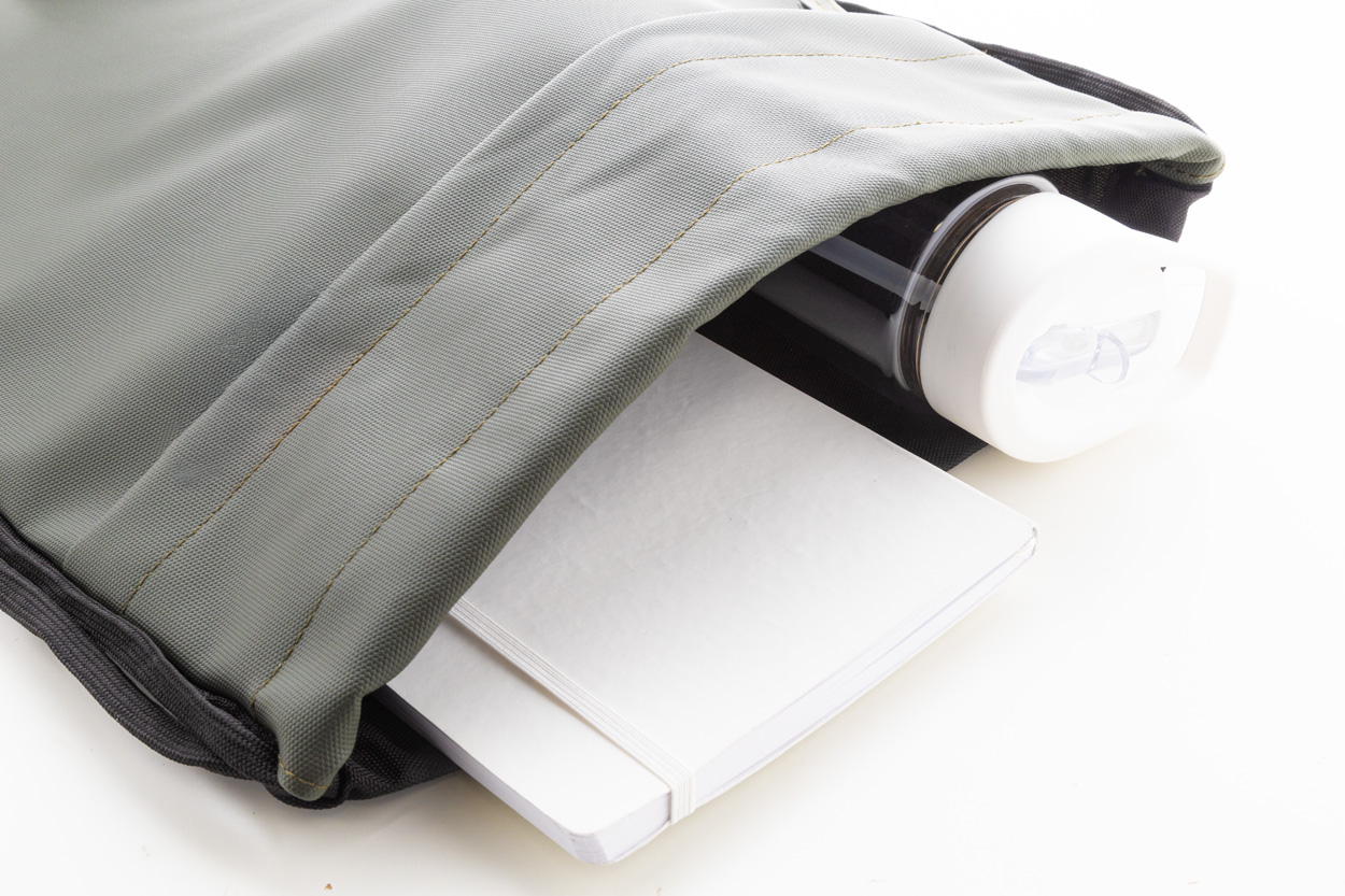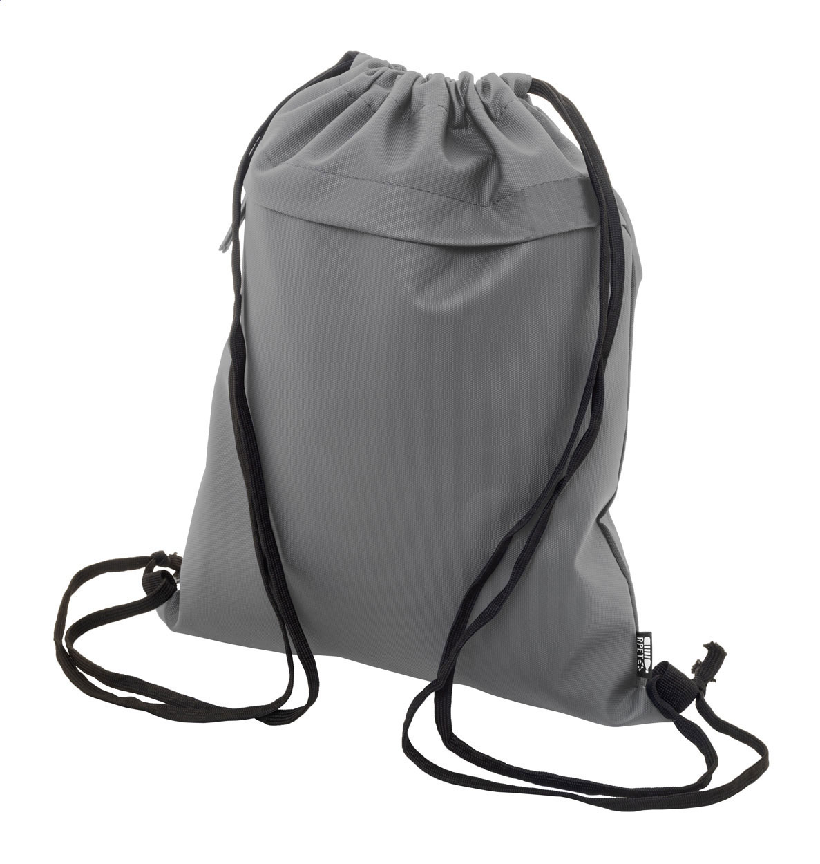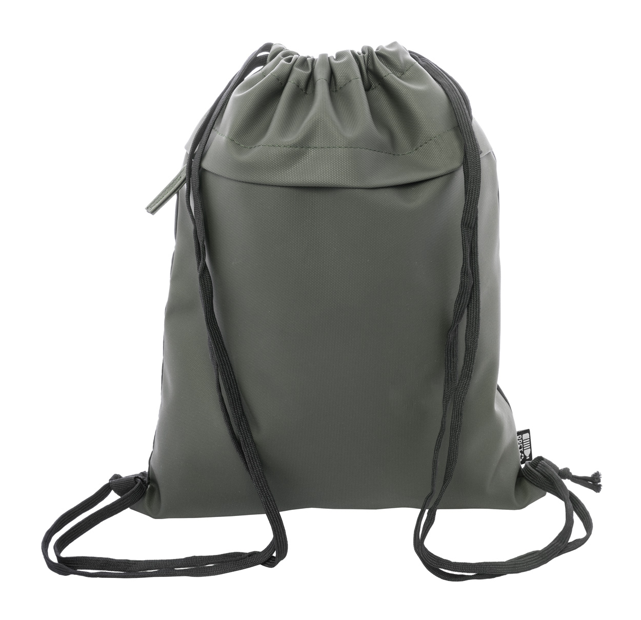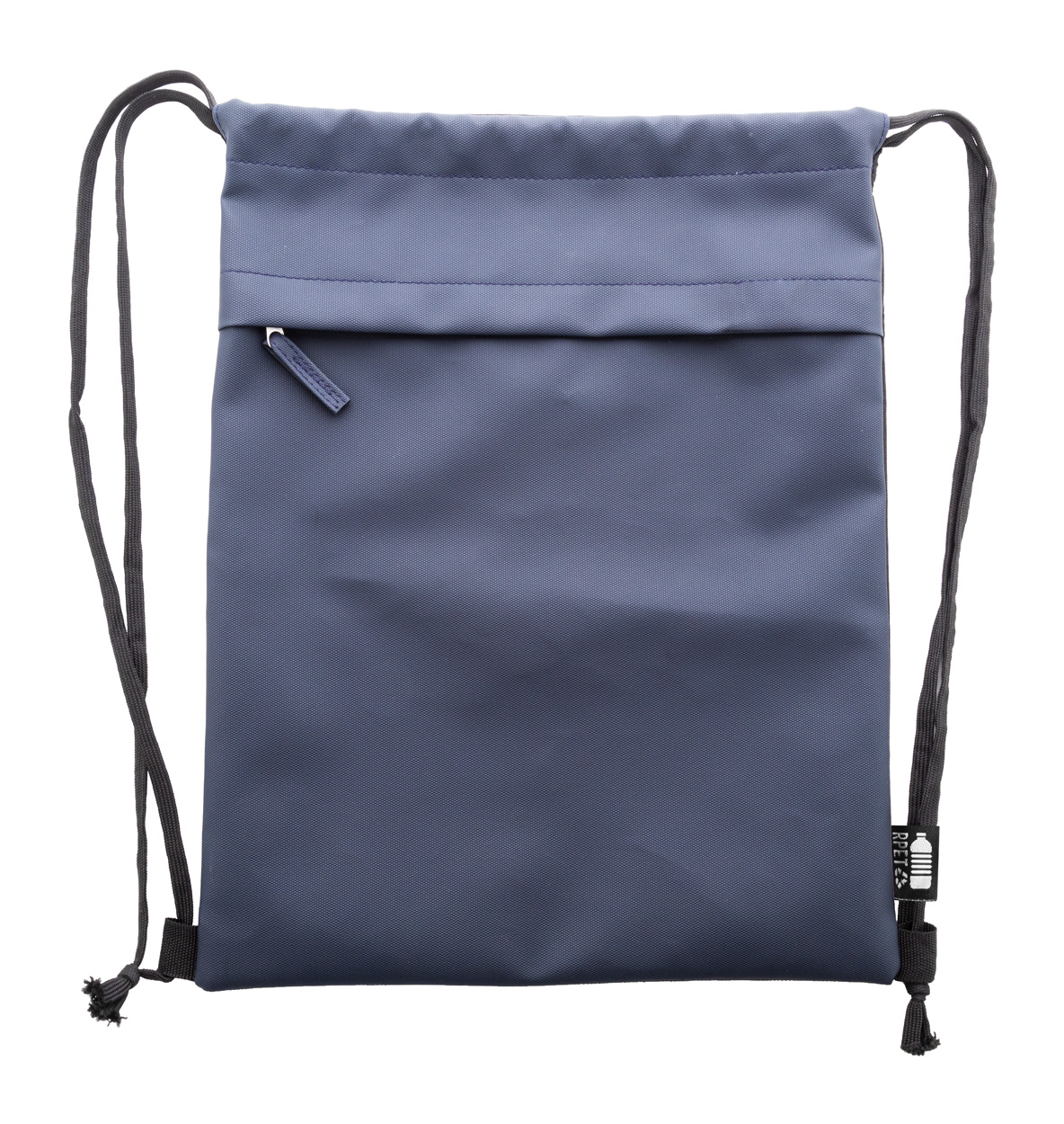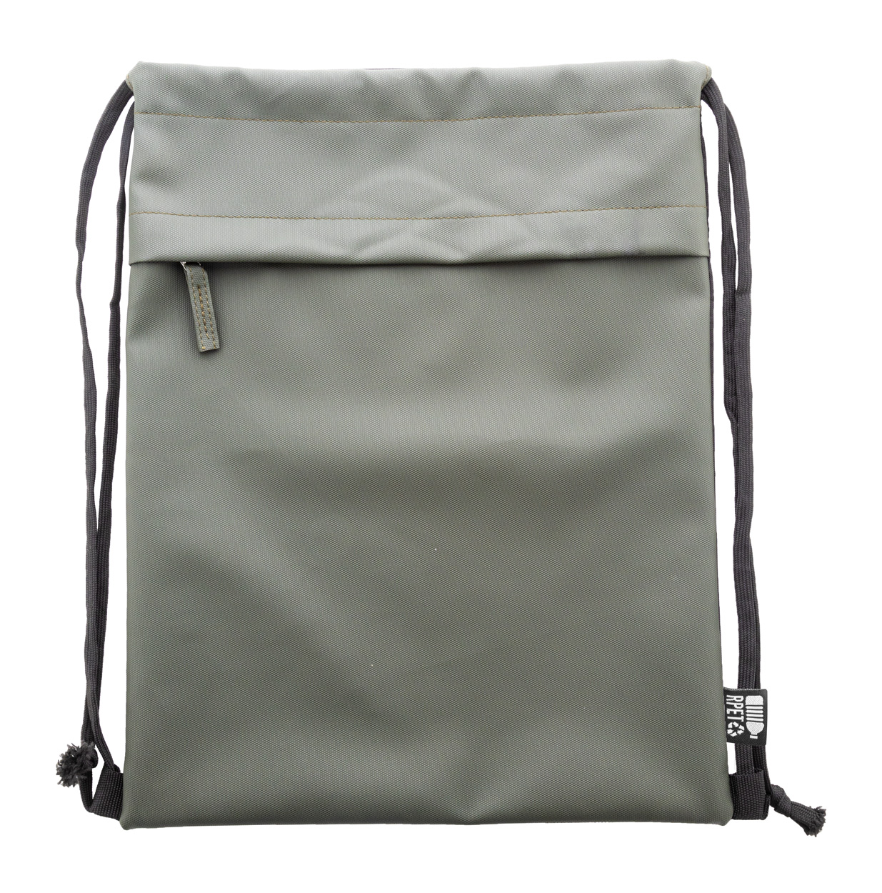 Worek ze ściągaczem RPET z przednią stroną powlekaną PU i kieszenią z przodu zapinaną na suwak. Poliester RPET 600D powlekany PU z charakterystyczną metką RPET.