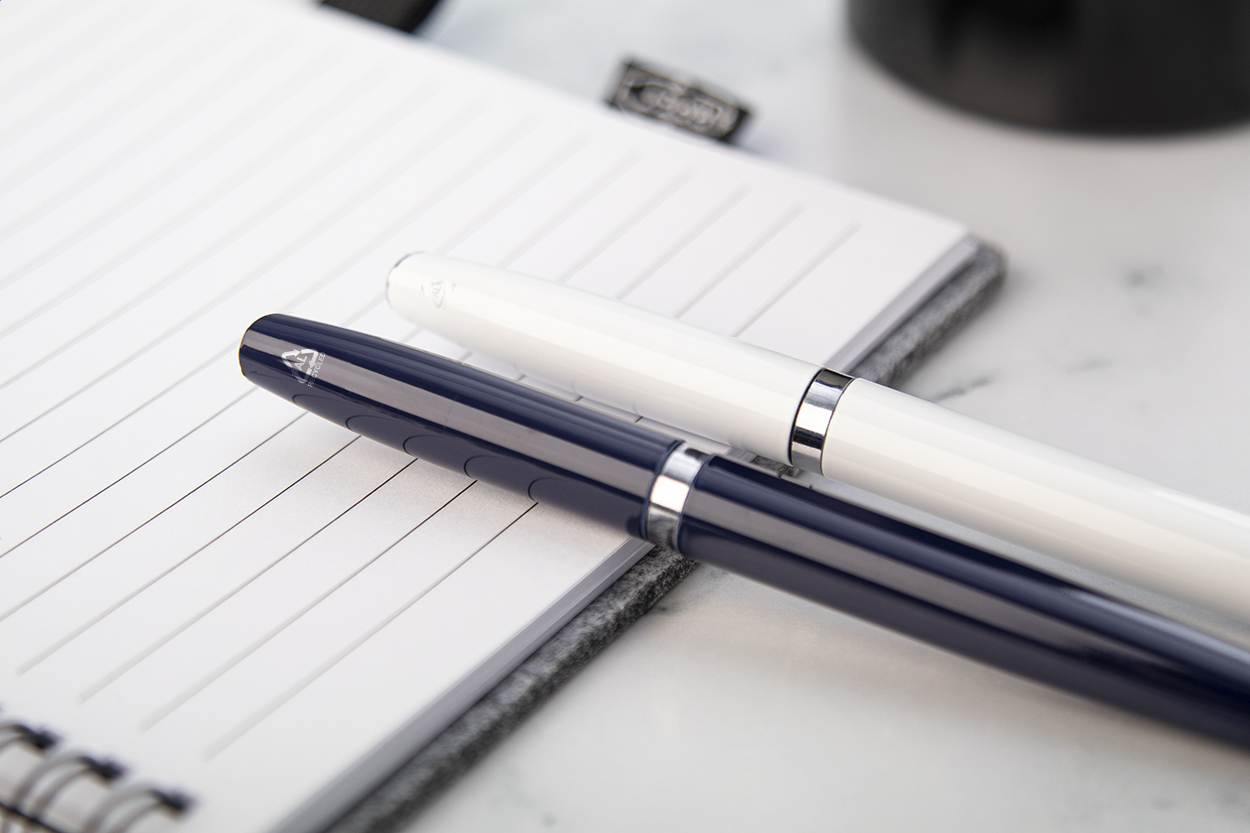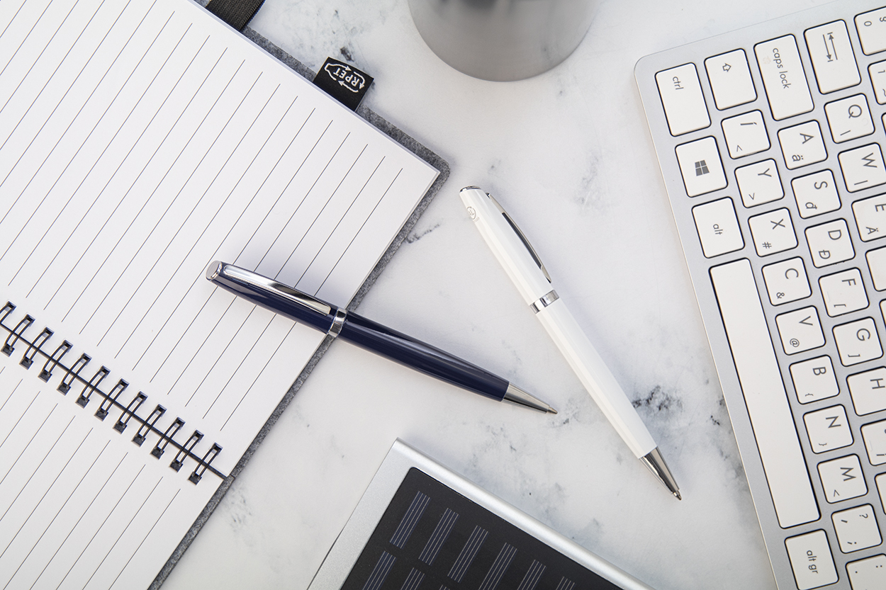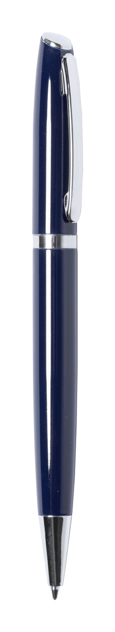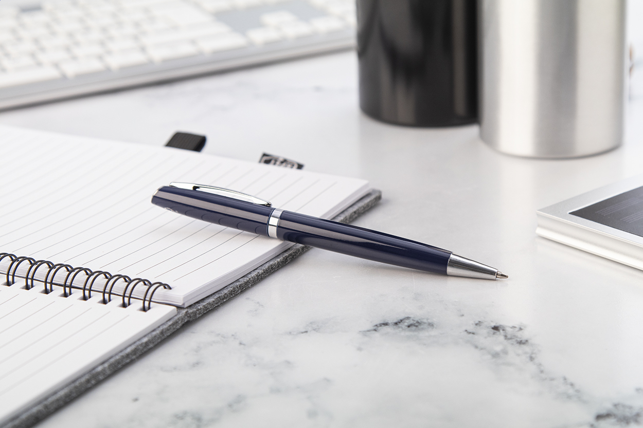 Aluminiowy długopis z recyklingu z niebieskim wkładem.
