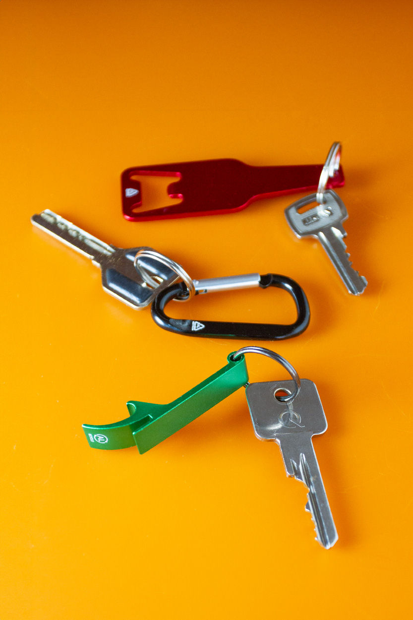 Karabińczyk z aluminium pochodzącego z recyklingu z metalowym kółkiem na klucze.