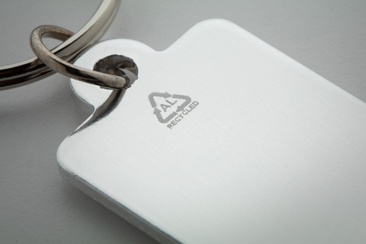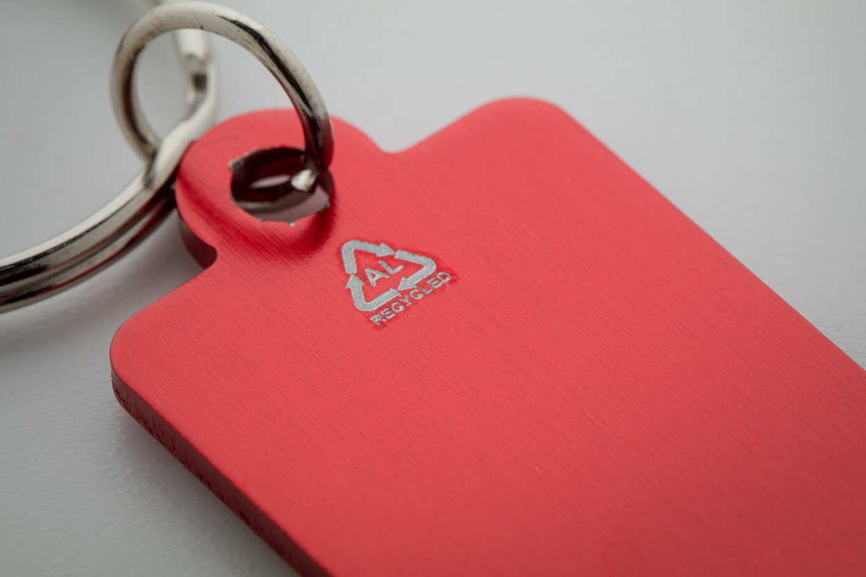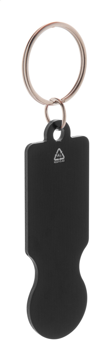 Aluminiowy brelok z recyklingu z żetonem do wózka na zakupy.