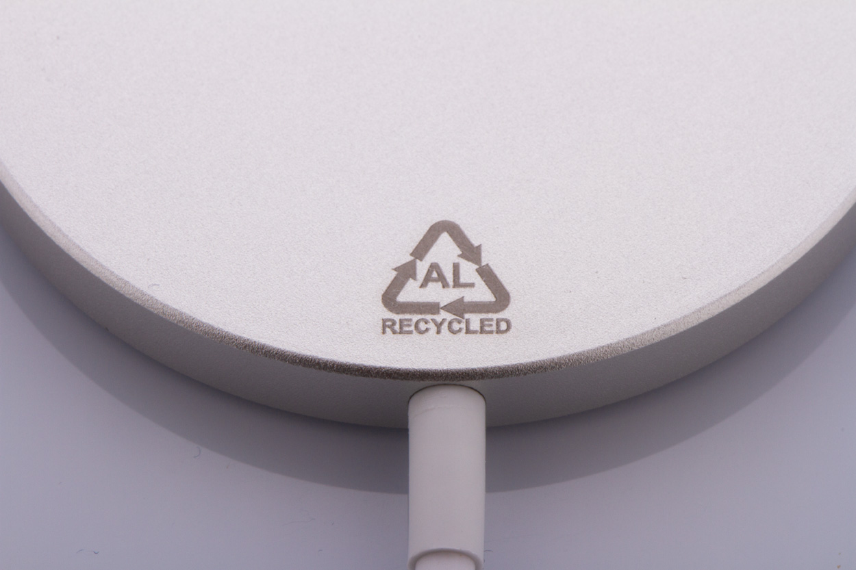 Magnetyczna szybka ładowarka indukcyjna (10W) w obudowie z aluminium pochodzącego z recyklingu. Kompatybilny z iPhone® 12 lub nowszym. Zawiera kabel ładowarki USB-C.