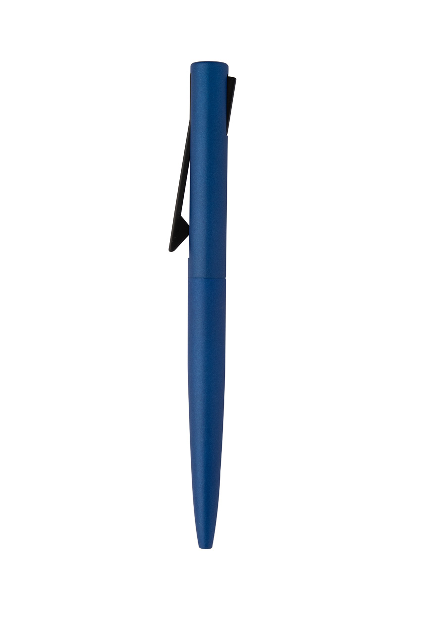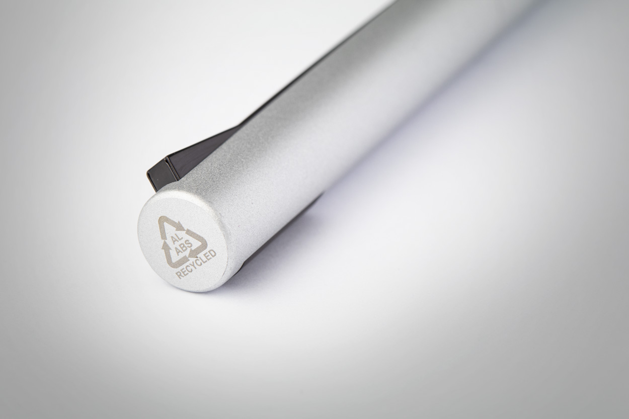 Długopis z aluminium pochodzącego z recyklingu, w matowym, metalicznym kolorze, z górnym korpusem z tworzywa ABS pochodzącego z recyklingu i ze specjalnym mechanizmem klipa. Z niebieskim wkładem.