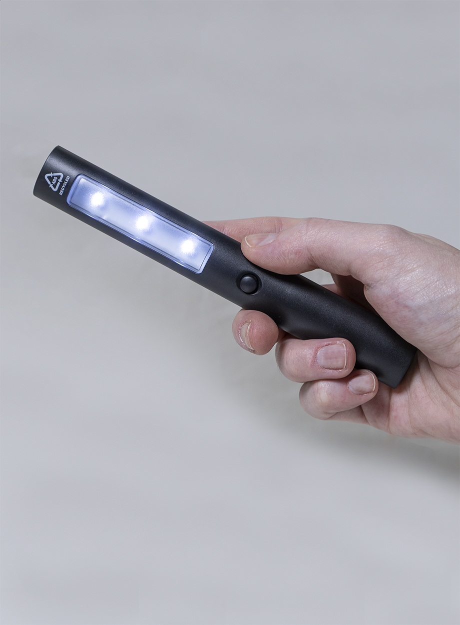 Latarka samochodowa z recyklingowanego ABS, z 3 diodami LED i magnesami z tyłu, umożliwiająca obsługę bez użycia rąk. W zestawie baterie guzikowe.