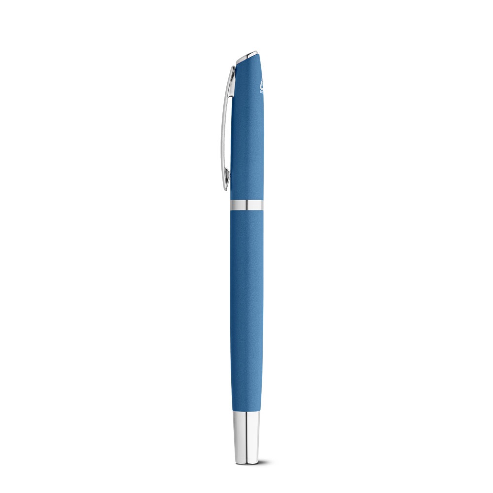 Zestaw długopisów i piór kulkowych z korpusem wykonanym z aluminium pochodzącego z recyklingu (100% rAL), metalowym klipsem i końcówkami. Zestawy są w tym samym kolorze, a długopis ma mechanizm obrotowy. Niebieski tusz. Dostarczany w pudełku z papieru z 100% recyklingu