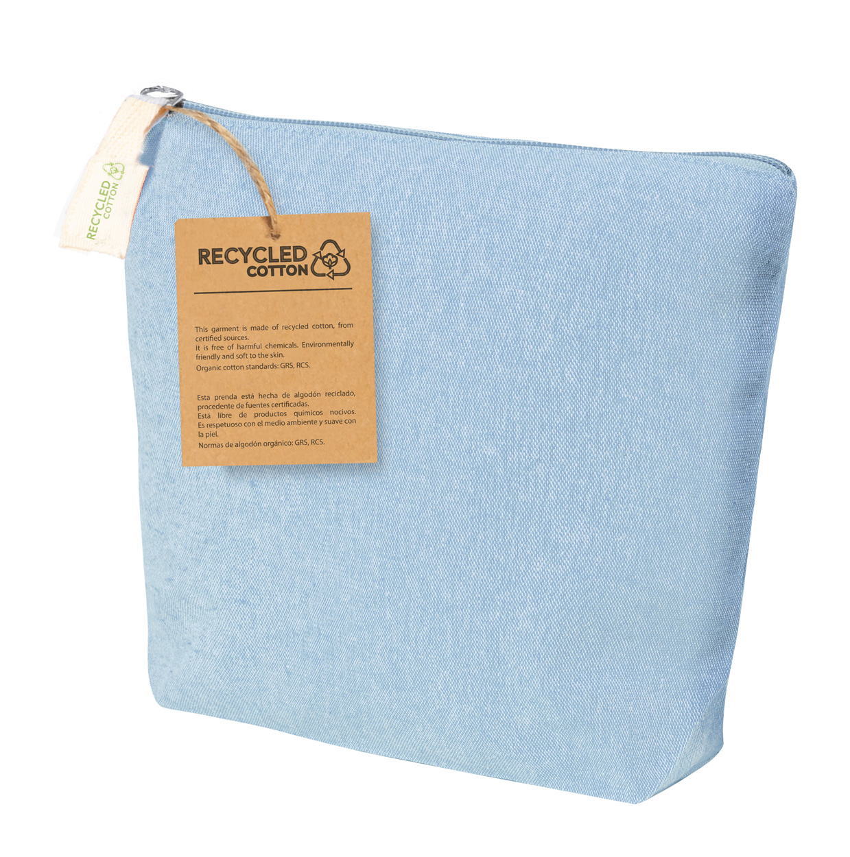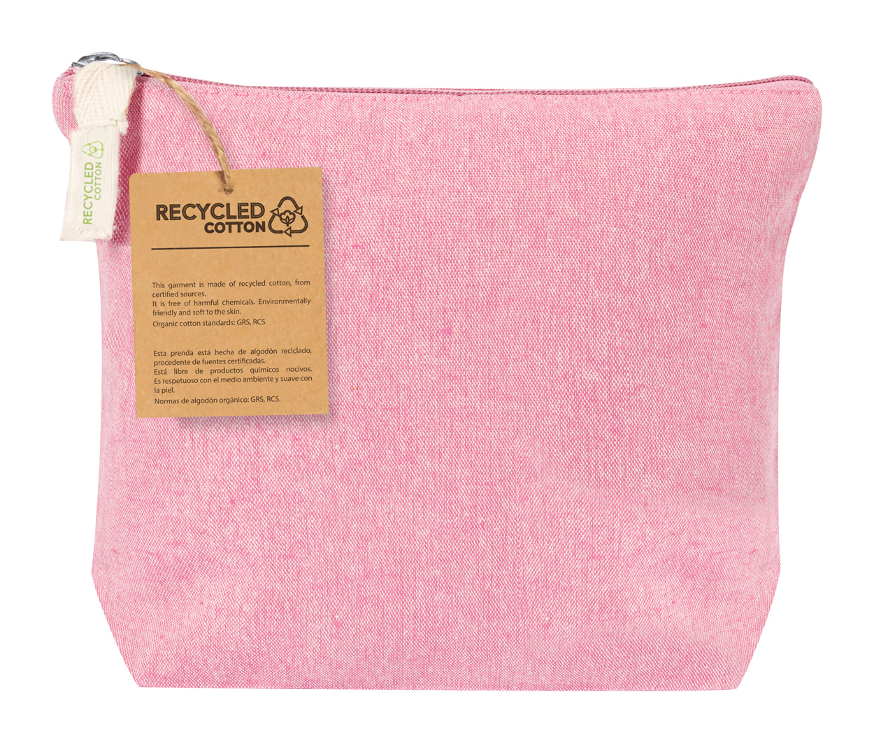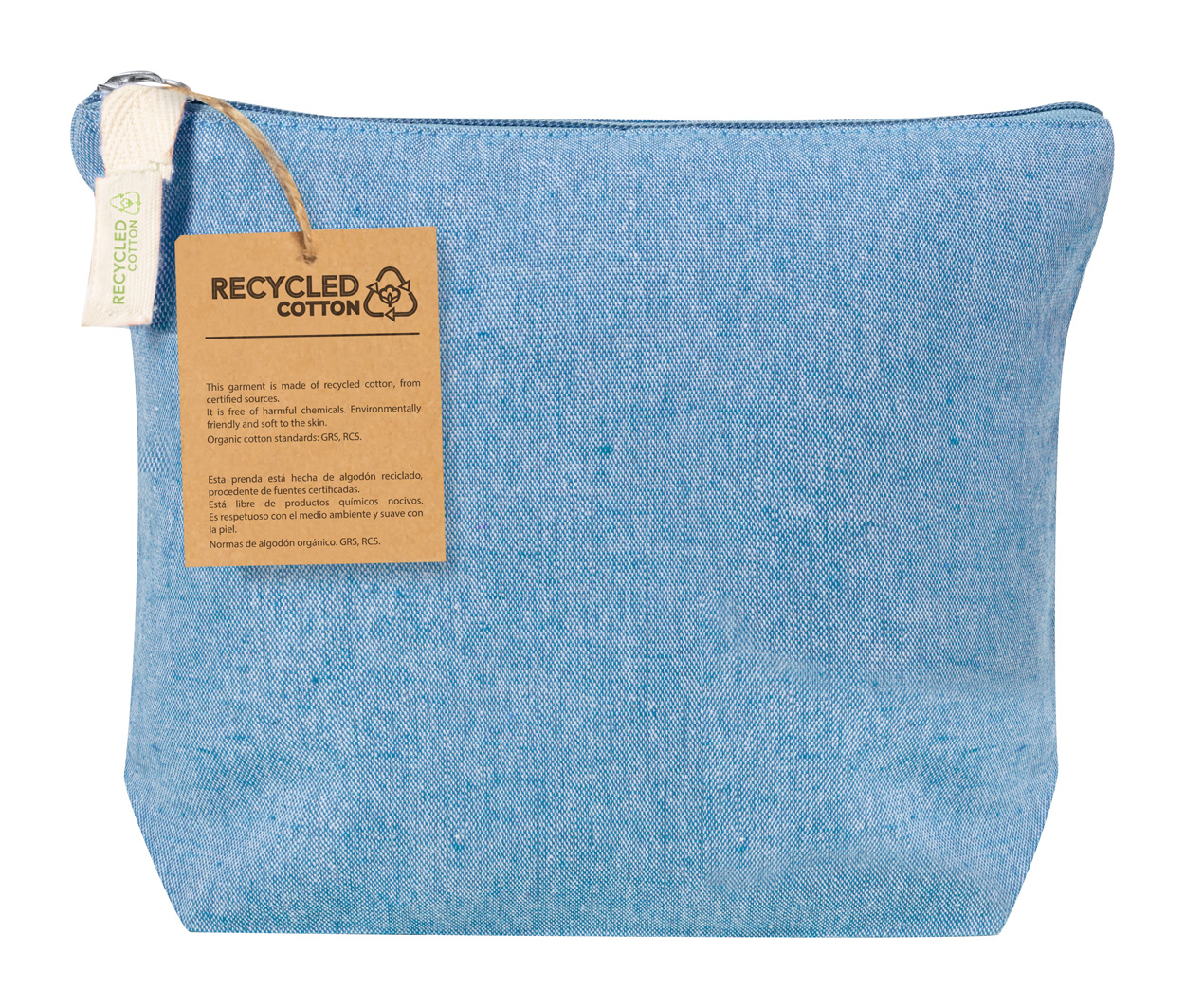 Zapinana na zamek kosmetyczka z bawełny pochodzącej z recyklingu. Z charakterystyczną etykietą z bawełny pochodzącej z recyklingu.
