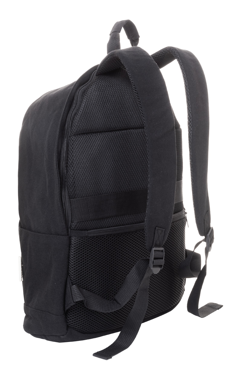 Plecak z płótna z recyklingu z główną kieszenią na suwak, wyściełaną przegrodą na laptopa (15″), kieszenią z przodu na suwak, kieszeniami bocznymi, paskiem do walizki, wyściełanymi plecami i paskami naramiennymi. Z ukrytą kieszenią antykradzieżową. 70% bawełny z recyklingu i 30% poliestru RPET. Z charakterystyczną metką z bawełny z recyklingu.