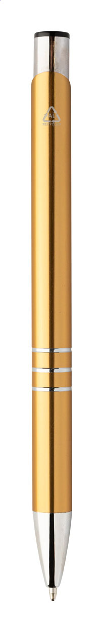 Długopis aluminiowy z recyklingu, z metalicznym wykończeniem i niebieskim wkładem.