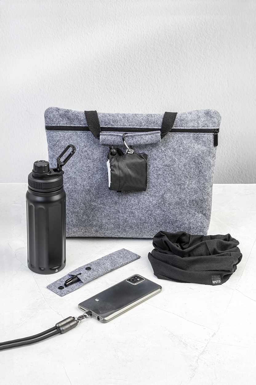 Filcowa torba na dokumenty lub laptopa z RPET, z główną komorą zapinaną na zamek i wewnętrzną kieszenią zapinaną na zamek. Pomieści laptopy do 15 cali. Z charakterystyczną metką RPET.