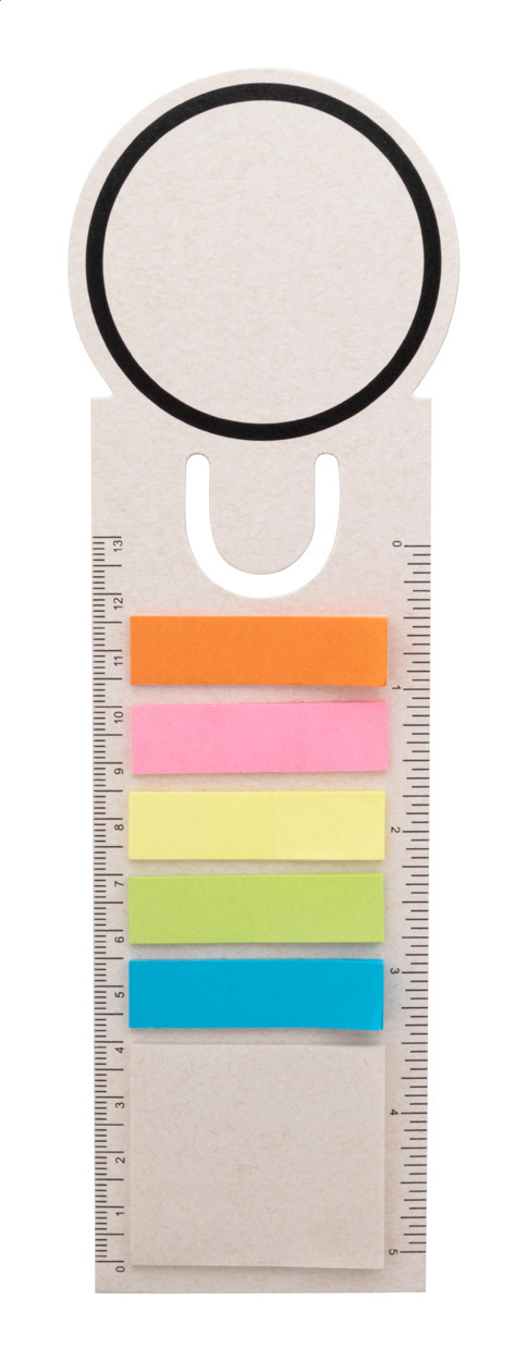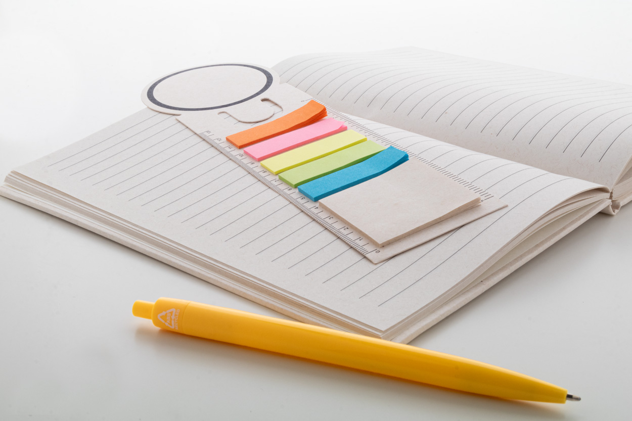 Zakładka i linijka z kartonu po mleku z recyklingu, zawierająca 15 karteczek samoprzylepnych i 75 znaczników stron (w 5 różnych kolorach).