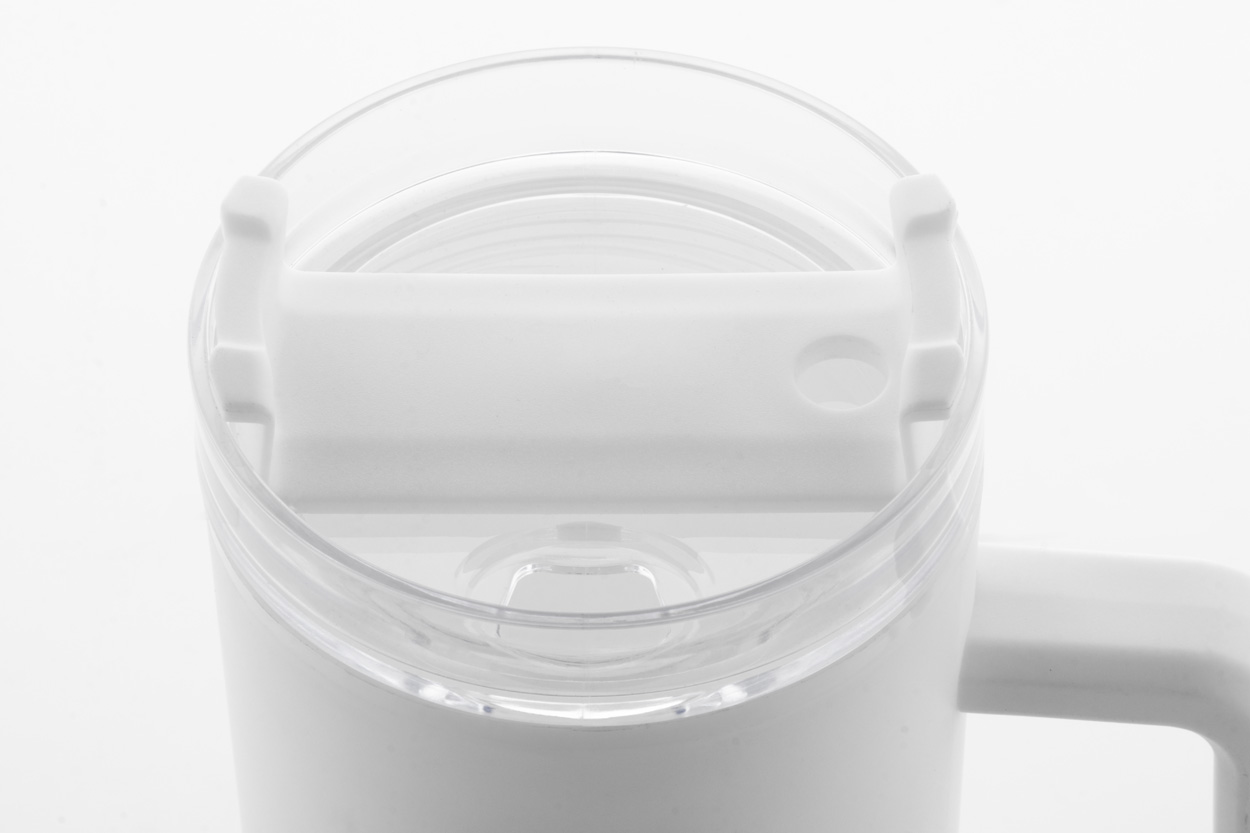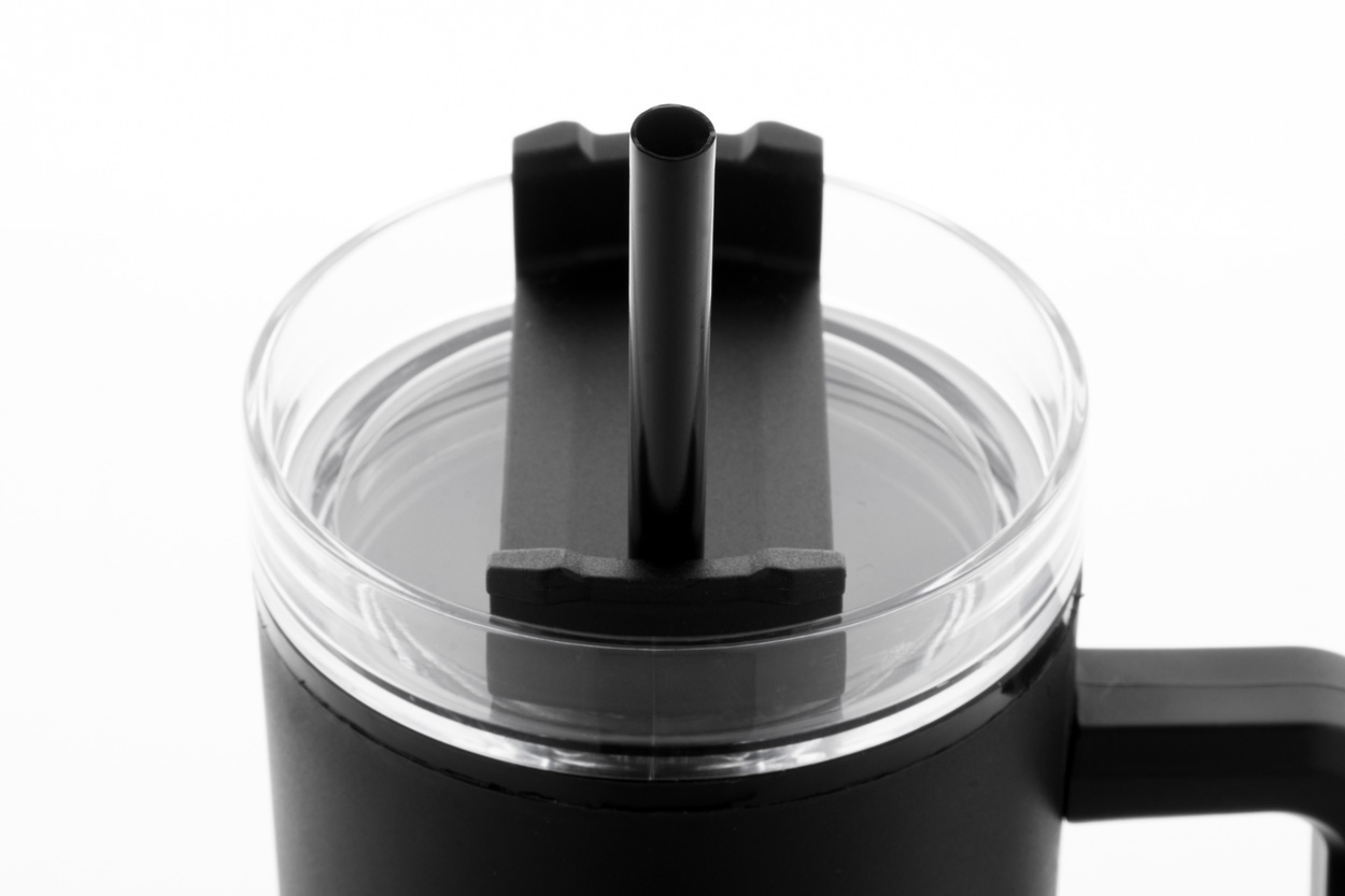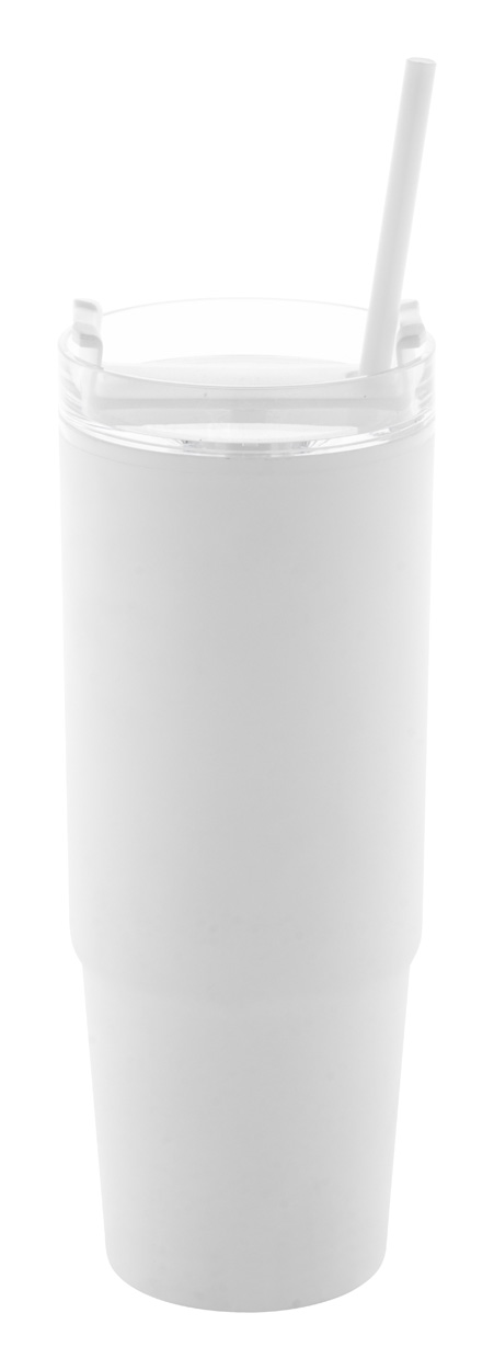 Kubek termiczny z podwójnymi ściankami, izolowany tworzywem PP z recyklingu, z plastikową pokrywką do picia i słomką. 900ml.