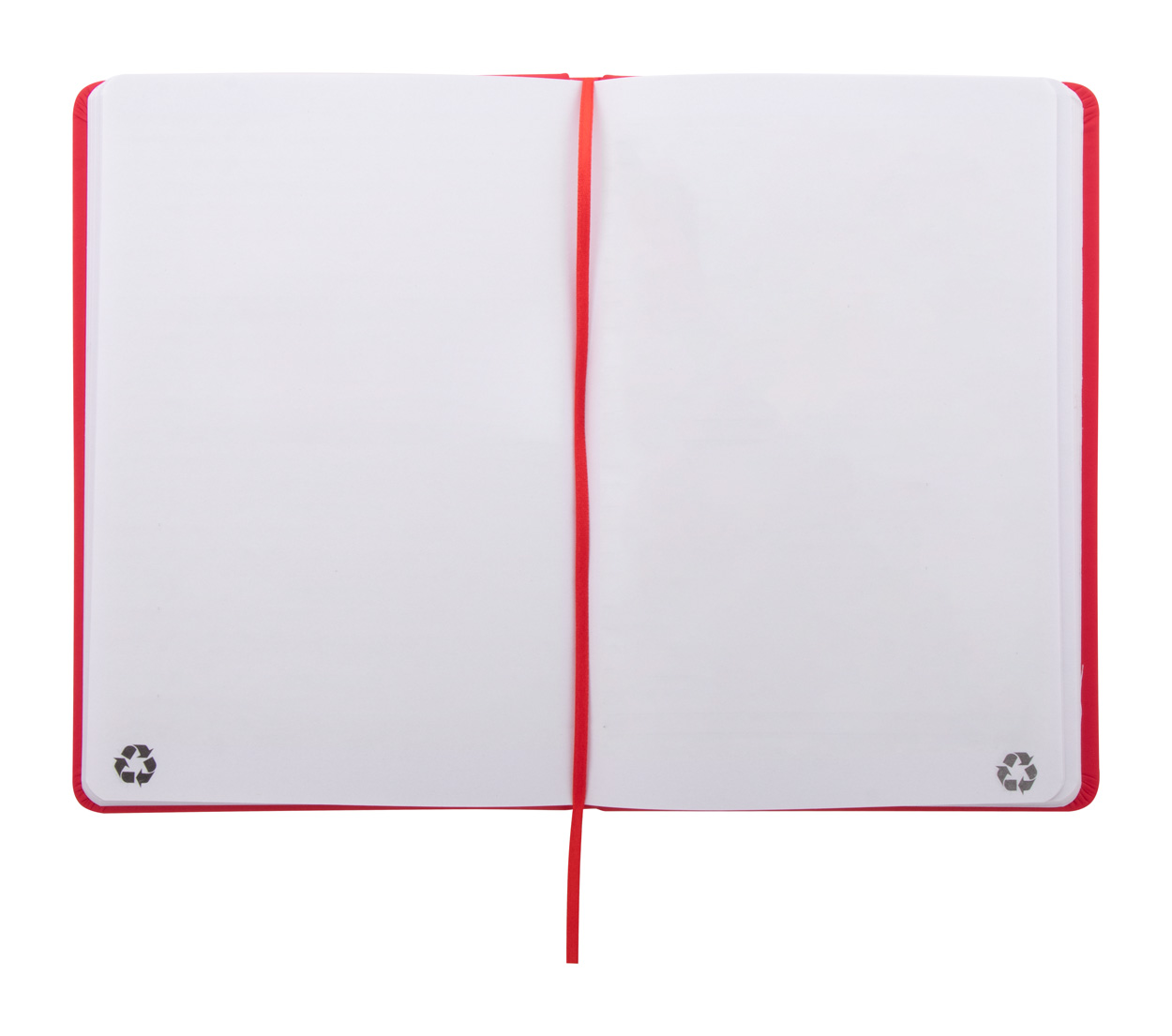 Notes pokryty skórą PU z recyklingu, zawierający 100 gładkich kartek z papieru pochodzącego z recyklingu. Z dopasowaną kolorystycznie zakładką i gumką. Rozmiar A5.