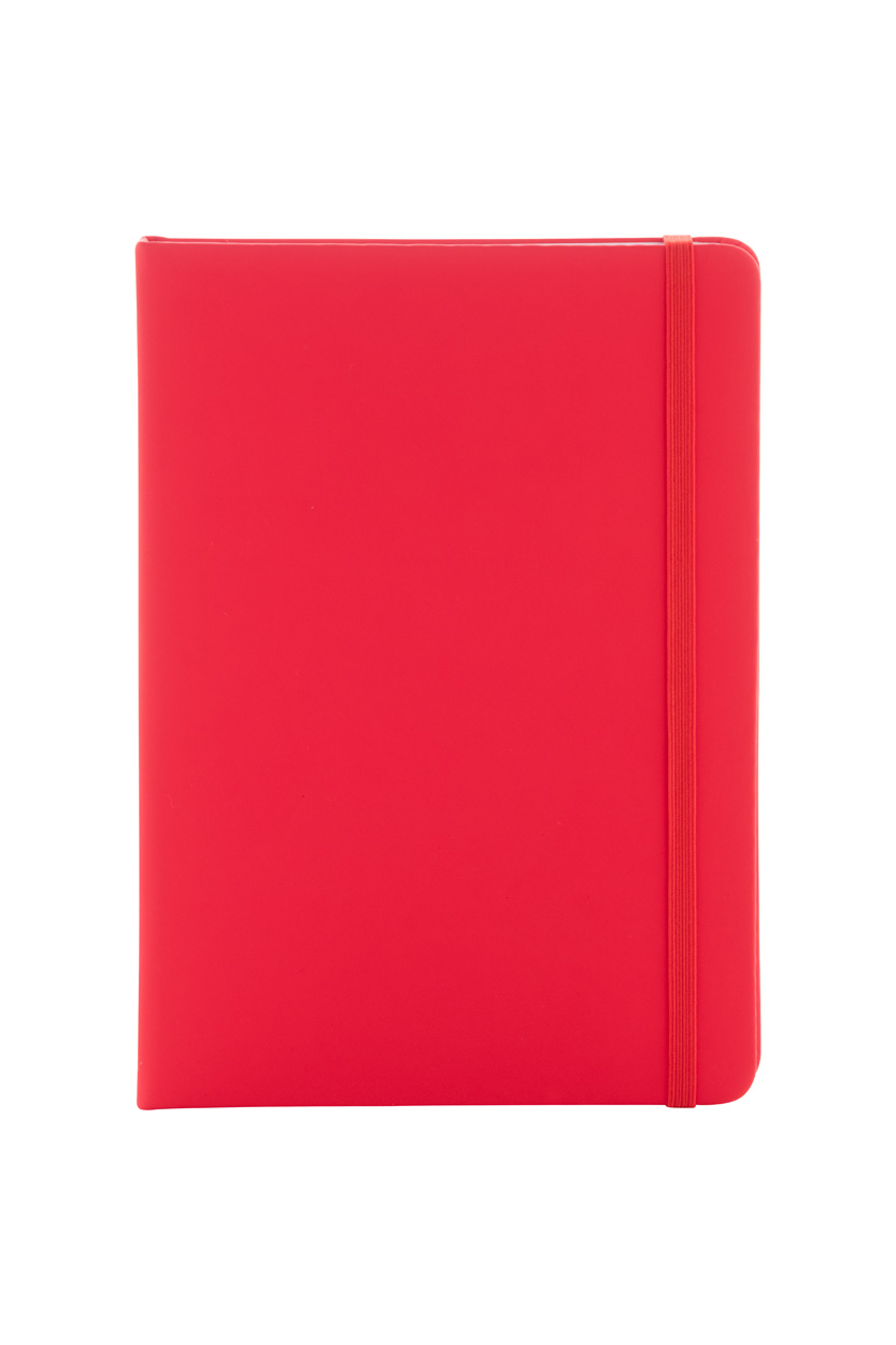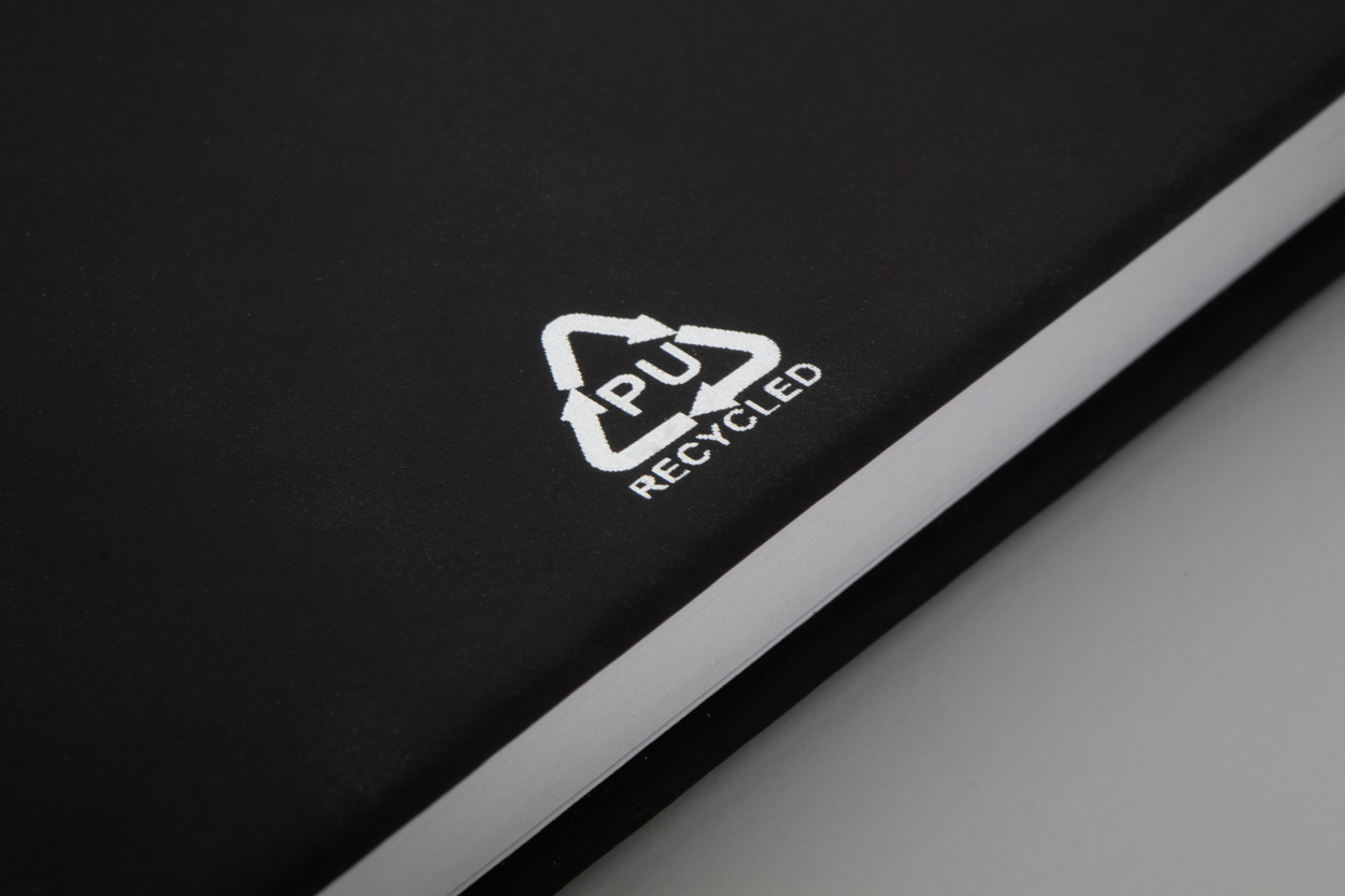 Notes z okładką ze skóry PU z recyklingu ze 100 kartkami w linie z papieru z recyklingu. Z dopasowaną kolorystycznie zakładką i gumką. Rozmiar A5.