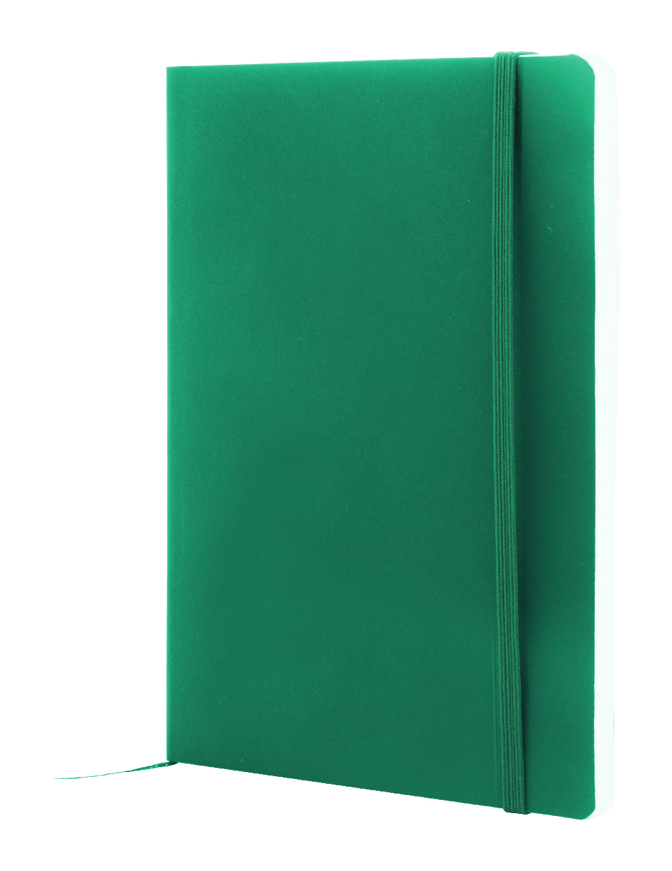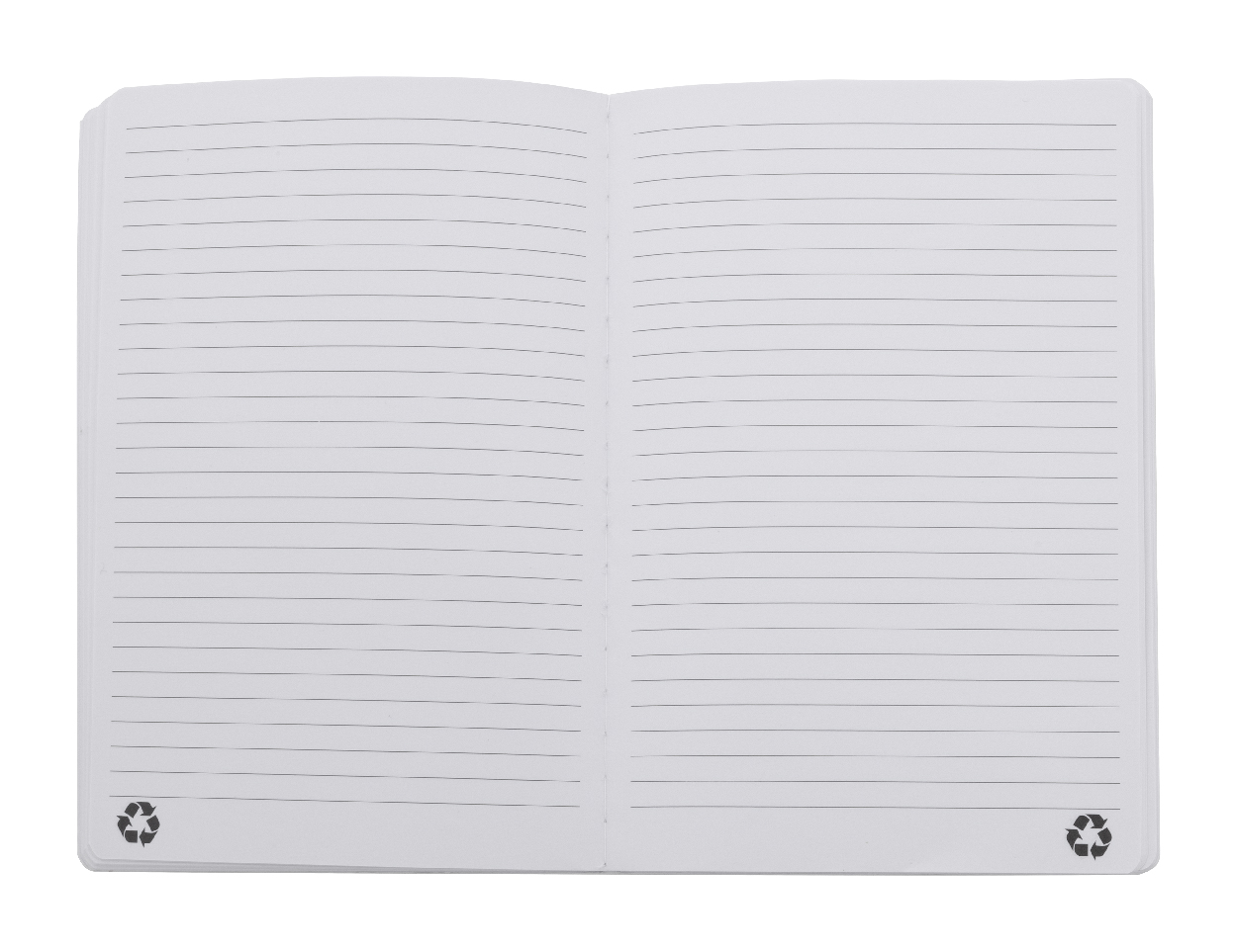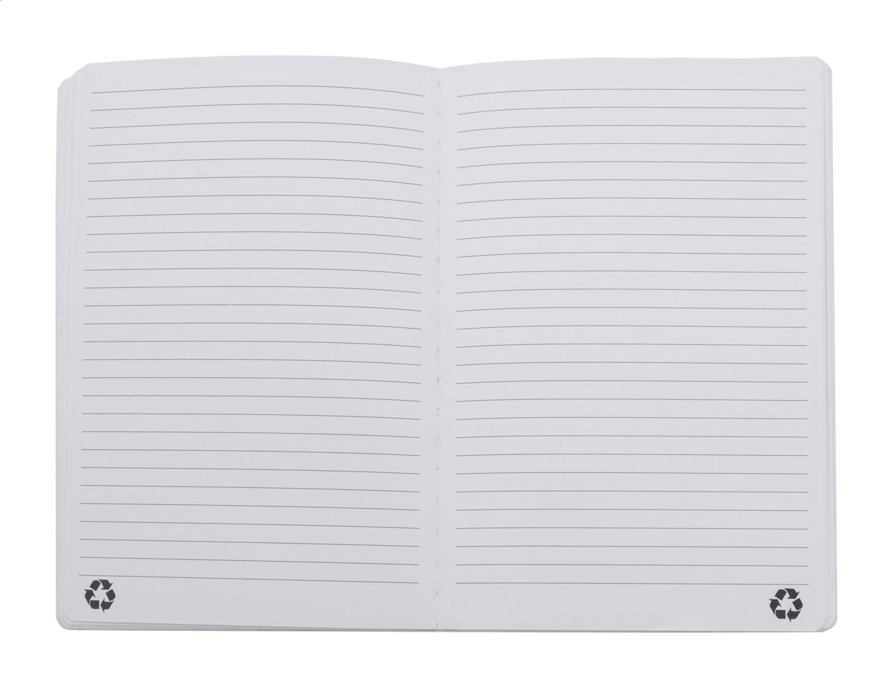 Notes z miękką okładką ze skóry PU z recyklingu, z 80 kartkami w linie z papieru z recyklingu. Z zakładką w pasującym kolorze i gumką. Rozmiar A5.