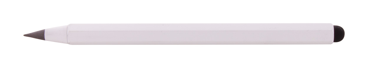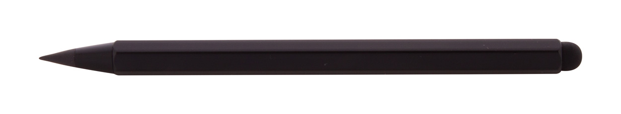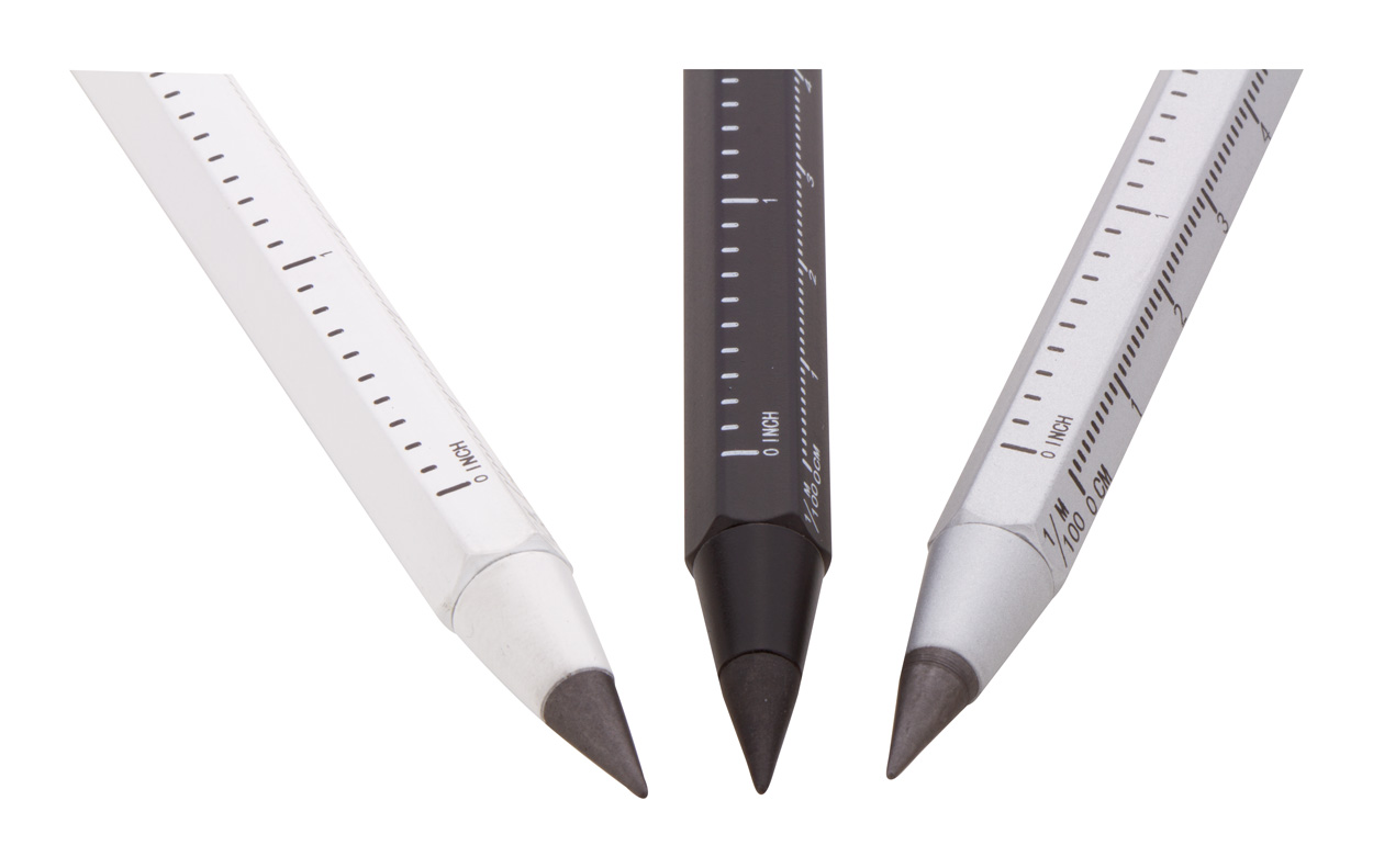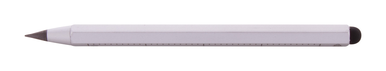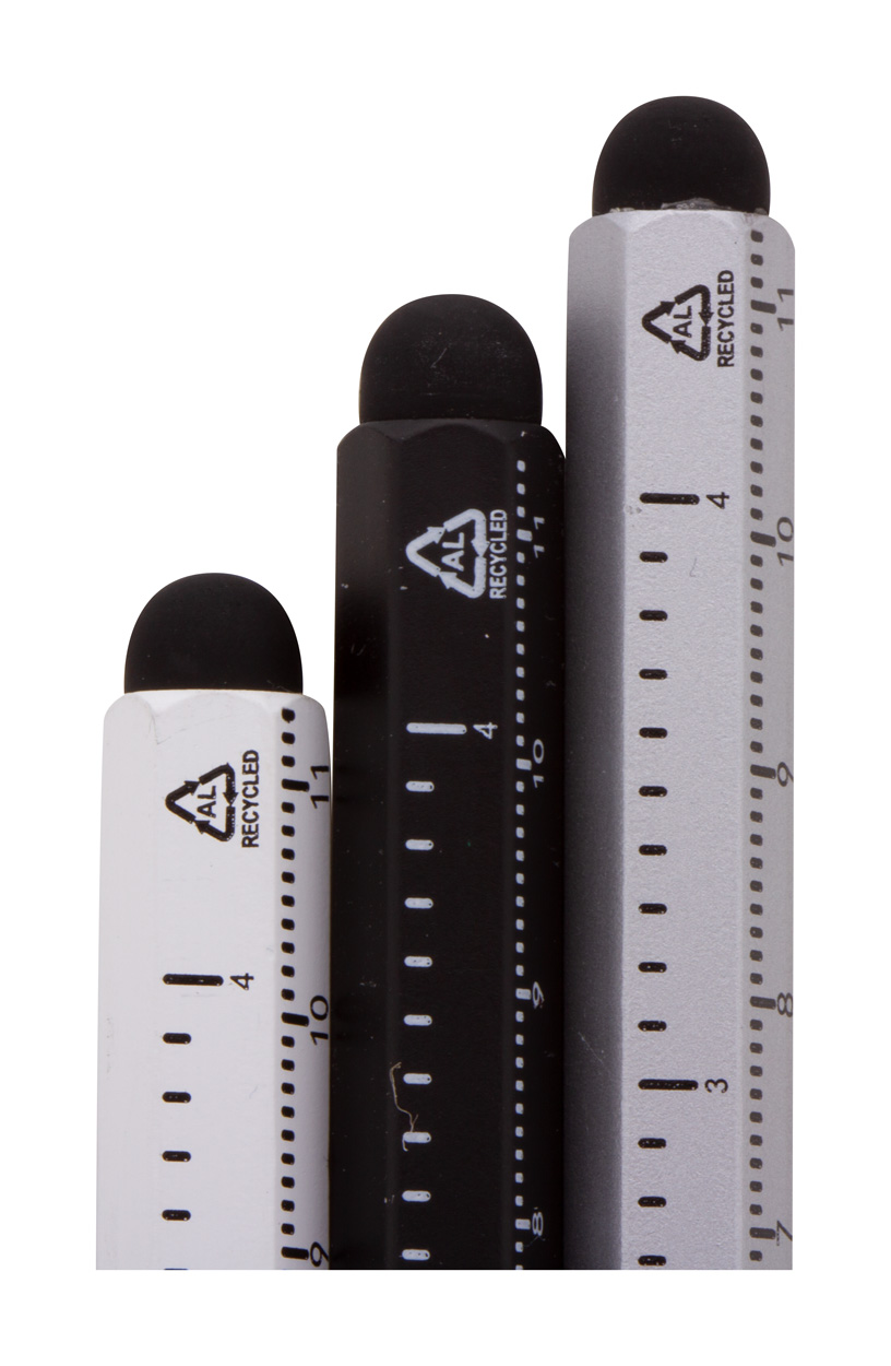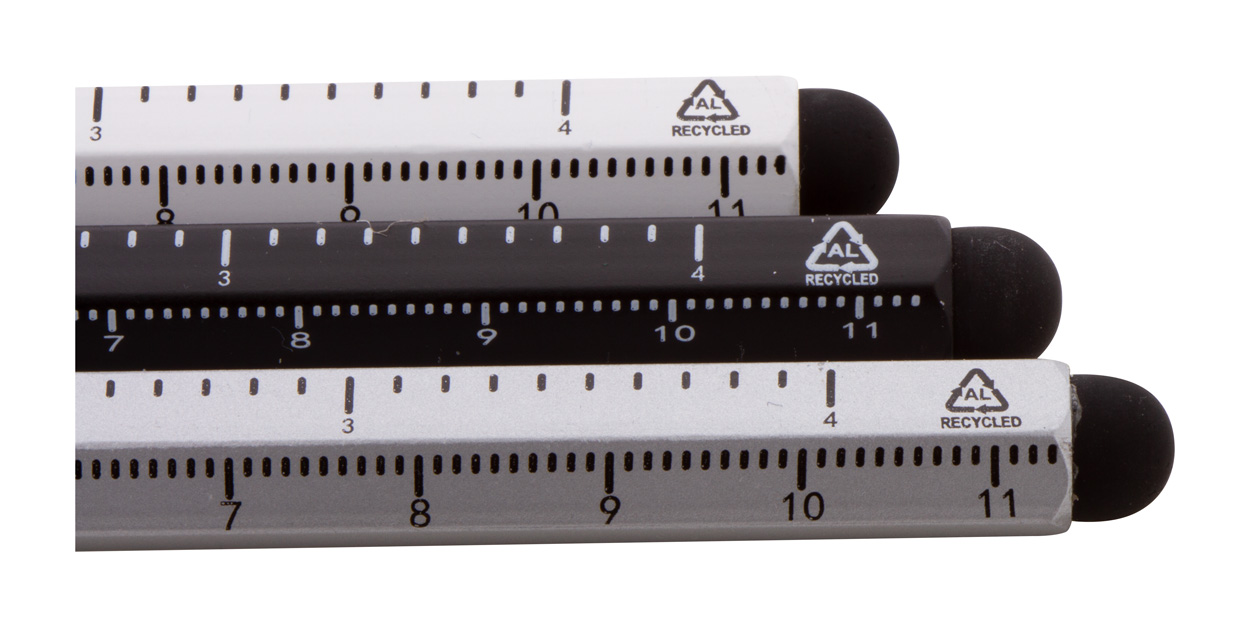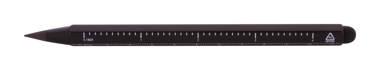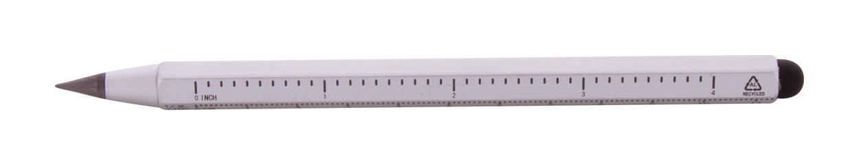 Bezatramentowy długopis z aluminium pochodzącego z recyklingu z końcówką do ekranów dotykowych i końcówką piszącą ze stopu metalu, który utlenia papier. Z sześciokątnym korpusem zawierającym linijki 11 cm i 4 cale. Ten długopis pisze podobnie do ołówka, a także można go wymazywać.