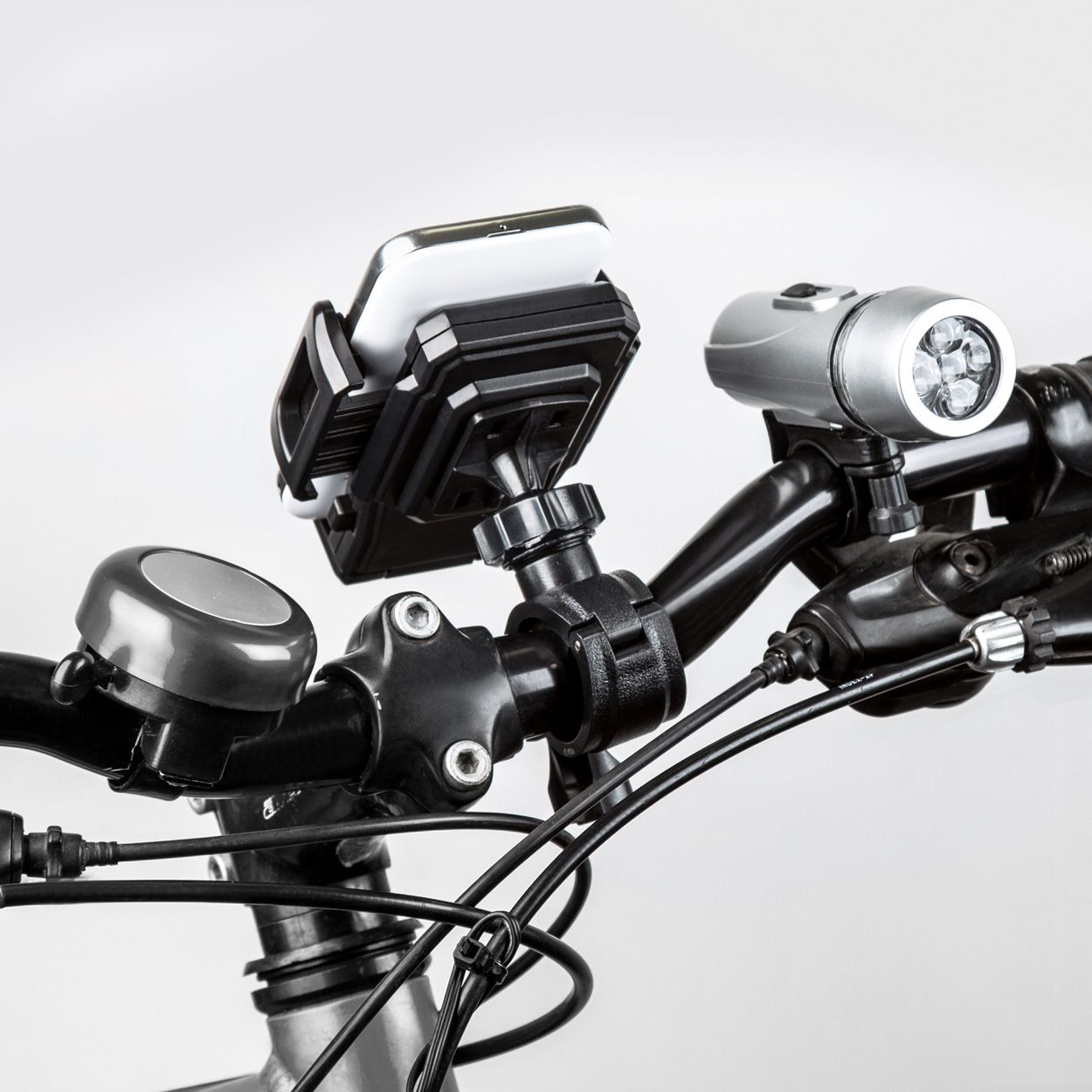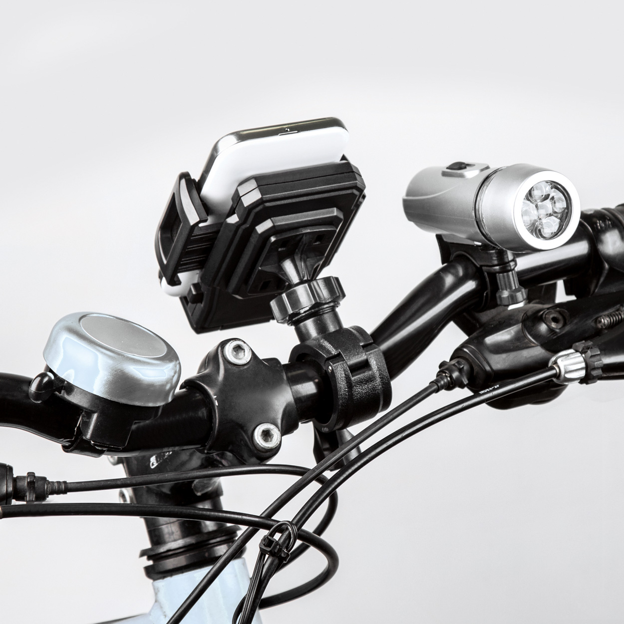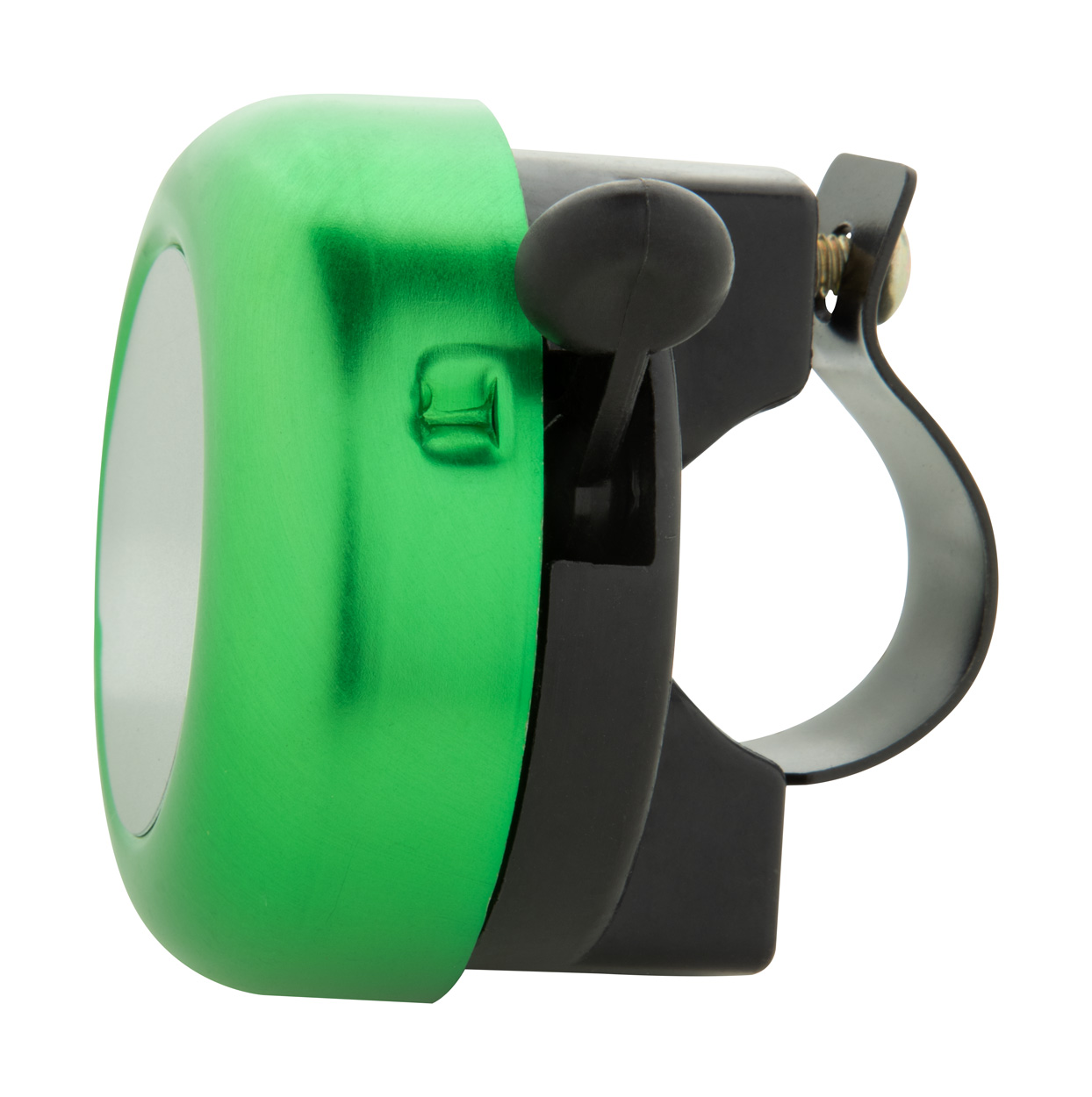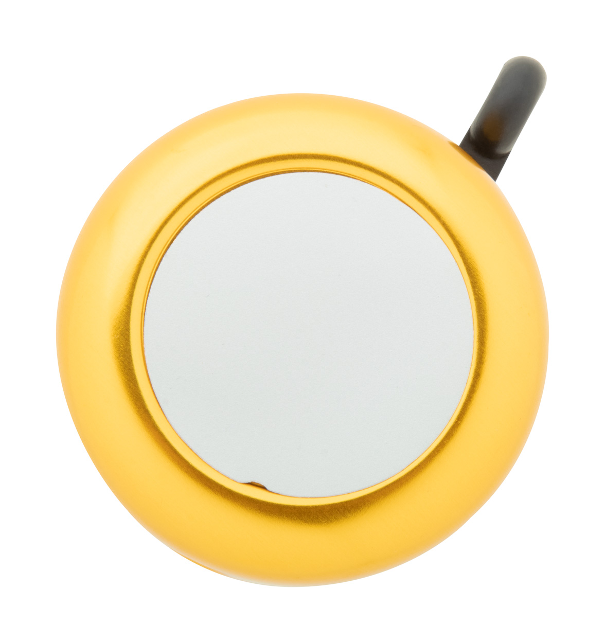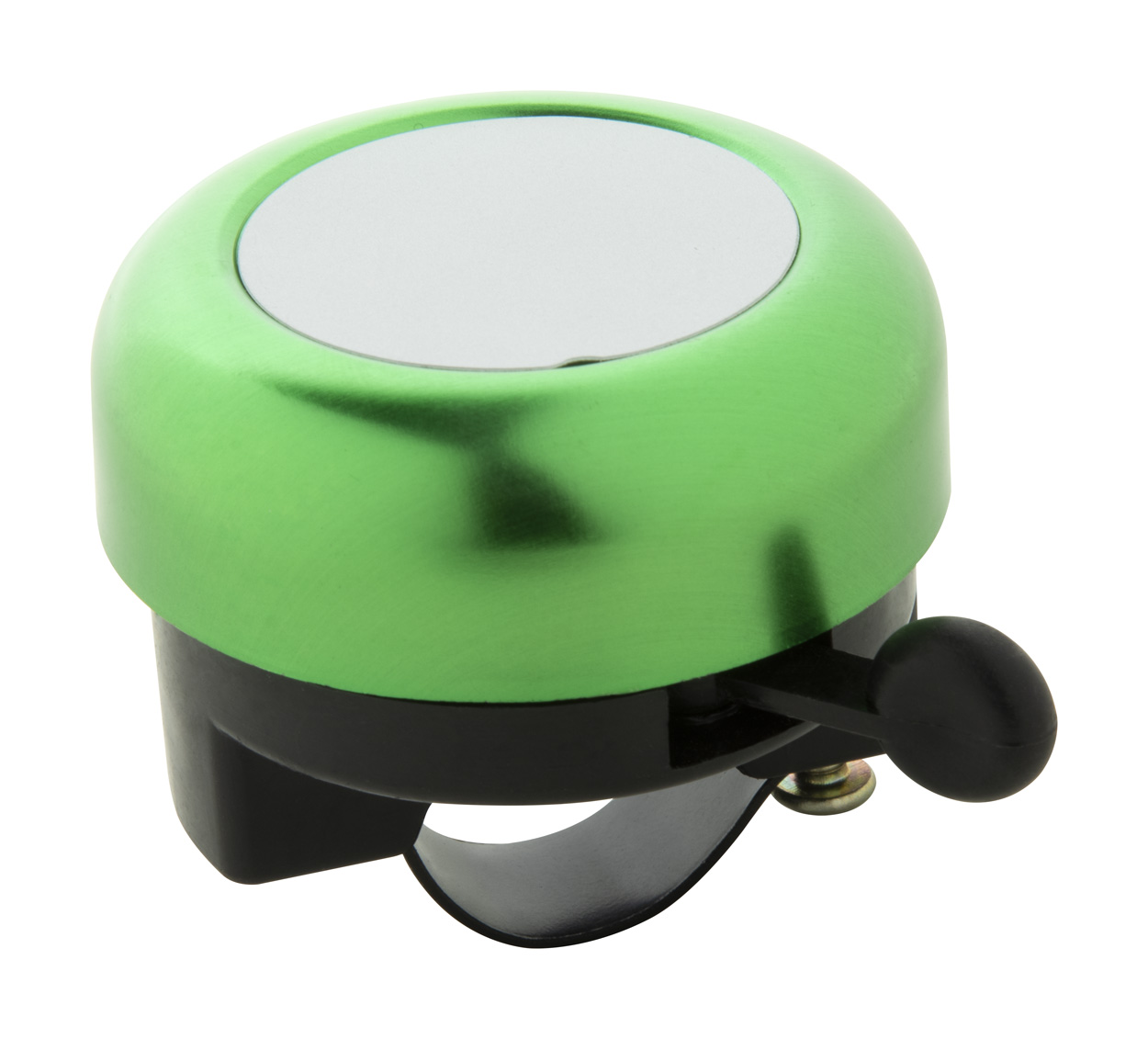 Aluminiowy dzwonek do roweru ze srebrną tabliczką.