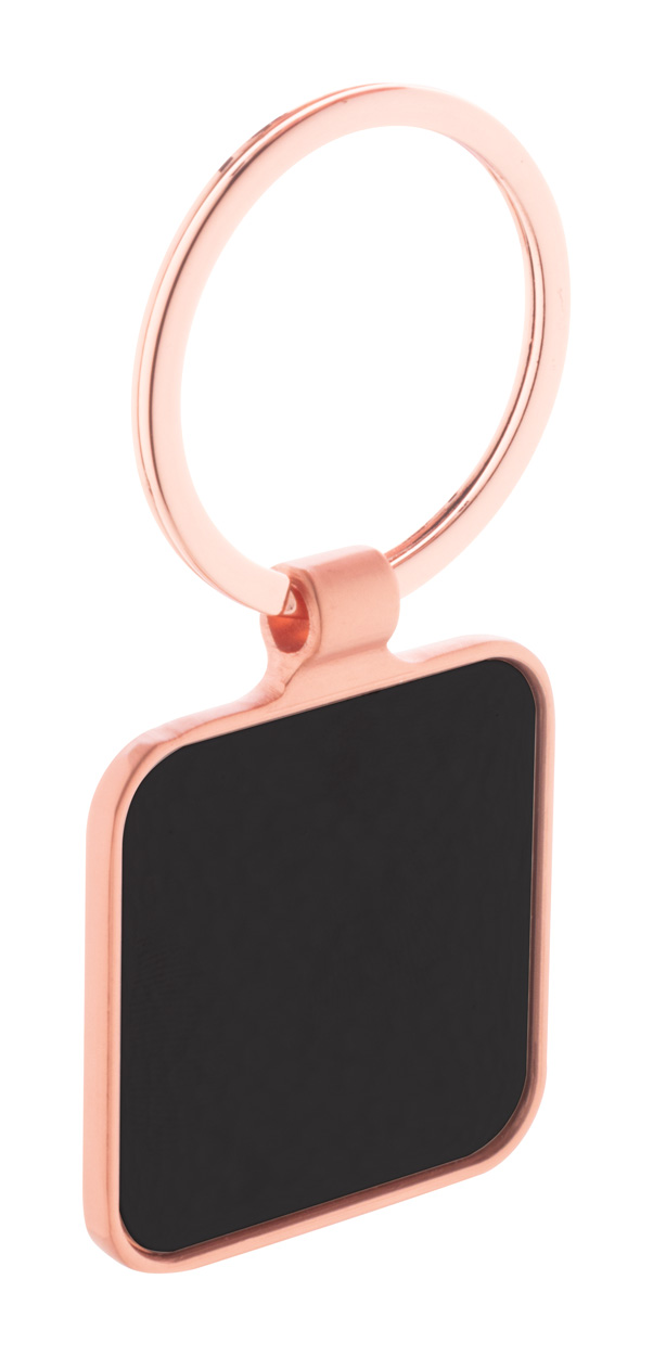Kwadratowy metalowy brelok do kluczy w złotym wykończeniu z brązową płytką. W pudełku z papieru kraft.