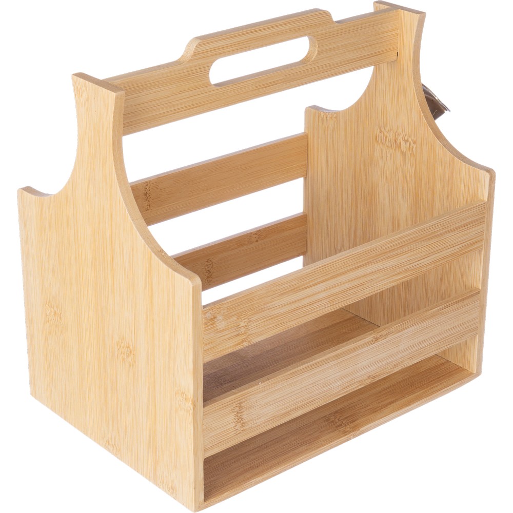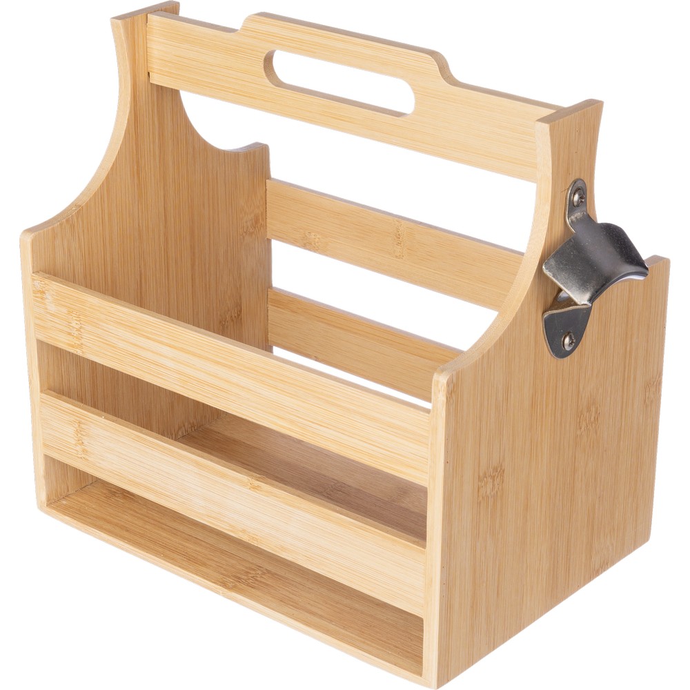 Skrzynka na butelki, umożliwia przechowywanie do 6 butelek, posiada wygodny uchwyt do przenoszenia, z boku znajduje się metalowy otwieracz do butelek, sprawdzi się przy transportowaniu ulubionego napoju samochodem, produkt wykonany z bambusa
