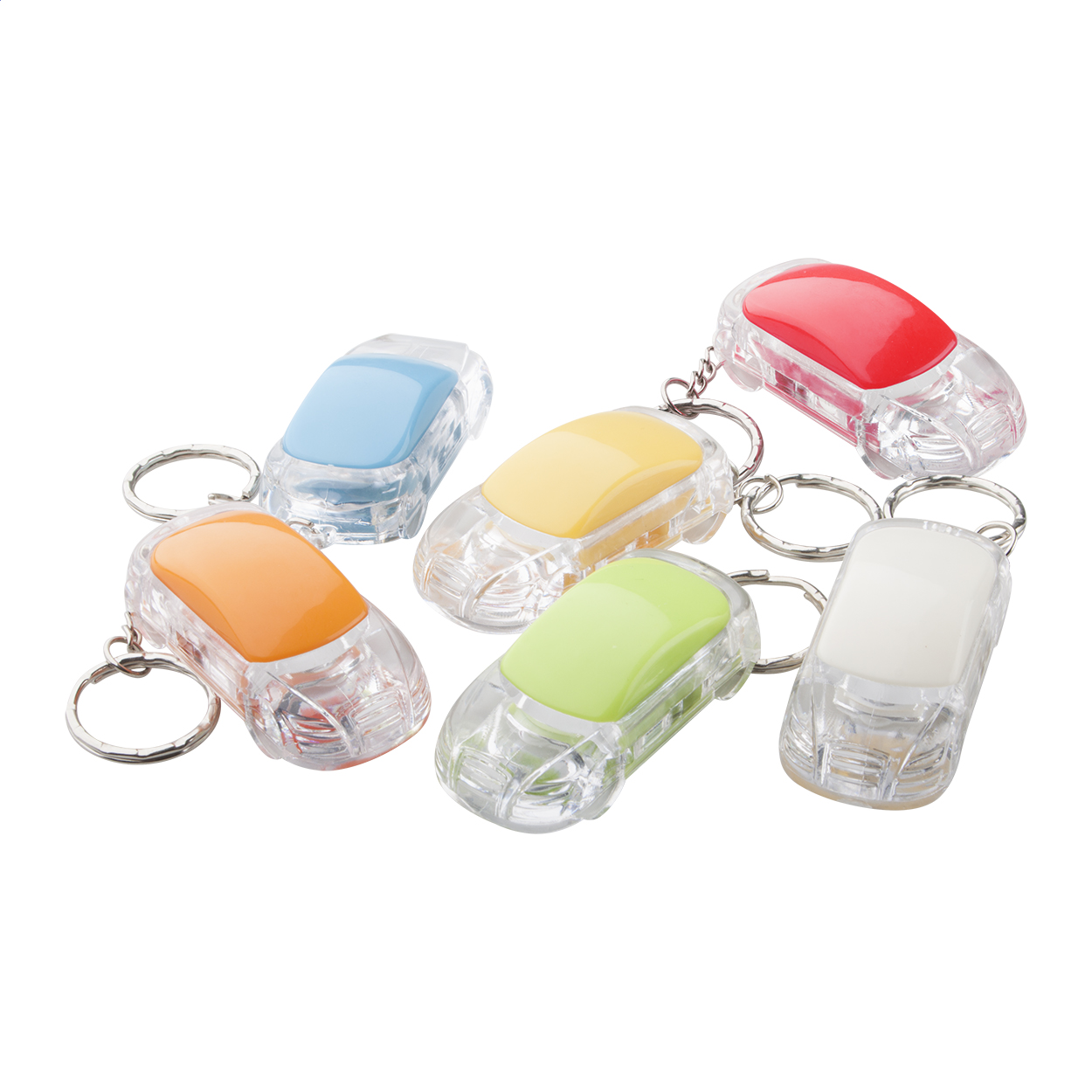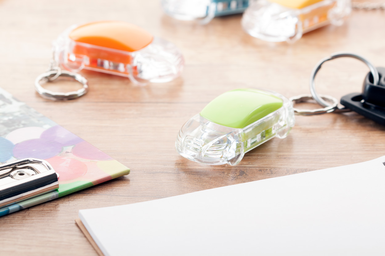 Brelok w kształcie samochodu z diodą LED i metalowym kółkiem. W zestawie z bateriami.