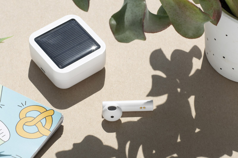 Słuchawki bezprzewodowe SUONO charakteryzują się bardzo dobrą jakością dźwięku i wygodą ze względu na doskonałe wyprofilowanie. Poręczne etui służy również jako stacja ładująca. Można je zasilać tradycyjnie poprzez ładowakę lub korzystając z panelu solarnego. Pojemność akumulatora to 200mAh do naładowania którego wystarczy około 5-6 godzin na słońcu. Pojemność słuchawek to 30mAh, które wystarczy na około 2 godziny czasu pracy. Wbudowany mikrofon pozwala na prowadzenie rozmów telefonicznych, a umieszczone na słuchawkach przyciski pozwalają na pauzowanie, przewijanie utworów, jak i na wezwanie asystenta głosowego. Wyświetlacz wskazuje na stopień naładowania baterii, jak i powiadamia nas o rozpoczęciu ładowania słuchawek. Zgodność z bluetooth 5.0, możliwość używania tylko jednej słuchawki.